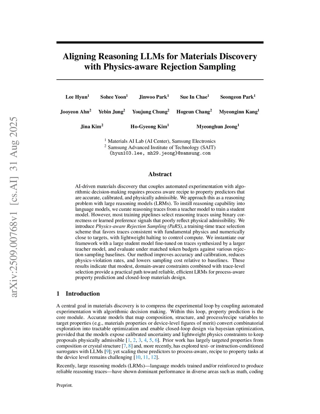 AI-driven materials discovery that couples automated experimentation with algorithmic decision-making requires process aware recipe to property predictors that are accurate, calibrated, and physically admissible. We approach this as a reasoning problem with large reasoning models (LRMs). To instill reasoning capability into language models, we curate reasoning traces from a teacher model to train a student model. However, most training pipelines select reasoning traces using binary correctness or learned preference signals that poorly reflect physical admissibility. We introduce Physics-aware Rejection Sampling (PaRS), a training-time trace selection scheme that favors traces consistent with fundamental physics and numerically close to targets, with lightweight halting to control compute. We instantiate our framework with a large student model fine-tuned on traces synthesized by a larger teacher model, and evaluate under matched token budgets against various rejection sampling baselines. Our method improves accuracy and calibration, reduces physics-violation rates, and lowers sampling cost relative to baselines. These results indicate that modest, domain-aware constraints combined with trace-level selection provide a practical path toward reliable, efficient LRMs for process-aware property prediction and closed-loop materials design.