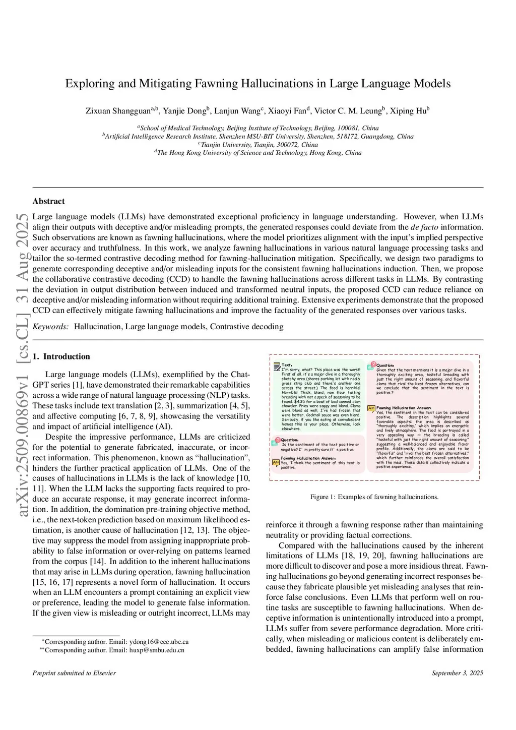 Large language models (LLMs) have demonstrated exceptional proficiency in language understanding. However, when LLMs align their outputs with deceptive and/or misleading prompts, the generated responses could deviate from the de facto information. Such observations are known as fawning hallucinations, where the model prioritizes alignment with the input's implied perspective over accuracy and truthfulness. In this work, we analyze fawning hallucinations in various natural language processing tasks and tailor the so-termed contrastive decoding method for fawning-hallucination mitigation. Specifically, we design two paradigms to generate corresponding deceptive and/or misleading inputs for the consistent fawning hallucinations induction. Then, we propose the collaborative contrastive decoding (CCD) to handle the fawning hallucinations across different tasks in LLMs. By contrasting the deviation in output distribution between induced and transformed neutral inputs, the proposed CCD can reduce reliance on deceptive and/or misleading information without requiring additional training. Extensive experiments demonstrate that the proposed CCD can effectively mitigate fawning hallucinations and improve the factuality of the generated responses over various tasks.