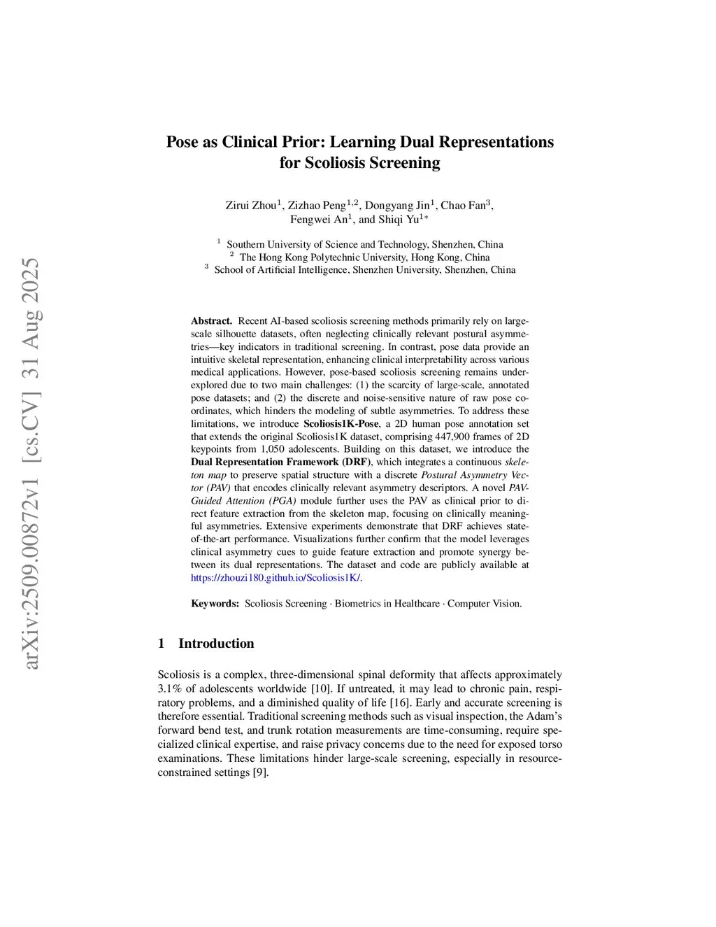 Pose as Clinical Prior: Learning Dual Representations for Scoliosis Screening