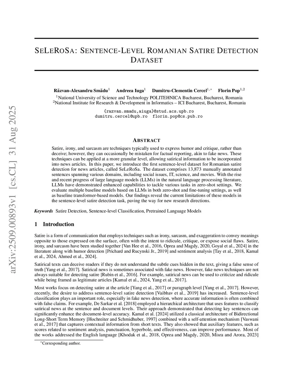 SeLeRoSa: Sentence-Level Romanian Satire Detection Dataset