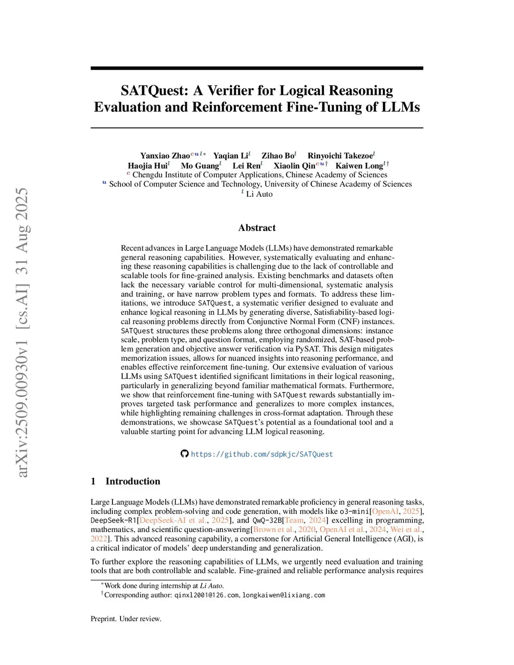 Recent advances in Large Language Models (LLMs) have demonstrated remarkable general reasoning capabilities. However, systematically evaluating and enhancing these reasoning capabilities is challenging due to the lack of controllable and scalable tools for fine-grained analysis. Existing benchmarks and datasets often lack the necessary variable control for multi-dimensional, systematic analysis and training, or have narrow problem types and formats. To address these limitations, we introduce SATQuest, a systematic verifier designed to evaluate and enhance logical reasoning in LLMs by generating diverse, Satisfiability-based logical reasoning problems directly from Conjunctive Normal Form (CNF) instances. SATQuest structures these problems along three orthogonal dimensions: instance scale, problem type, and question format, employing randomized, SAT-based problem generation and objective answer verification via PySAT. This design mitigates memorization issues, allows for nuanced insights into reasoning performance, and enables effective reinforcement fine-tuning. Our extensive evaluation of various LLMs using SATQuest identified significant limitations in their logical reasoning, particularly in generalizing beyond familiar mathematical formats. Furthermore, we show that reinforcement fine-tuning with SATQuest rewards substantially improves targeted task performance and generalizes to more complex instances, while highlighting remaining challenges in cross-format adaptation. Through these demonstrations, we showcase SATQuest's potential as a foundational tool and a valuable starting point for advancing LLM logical reasoning.