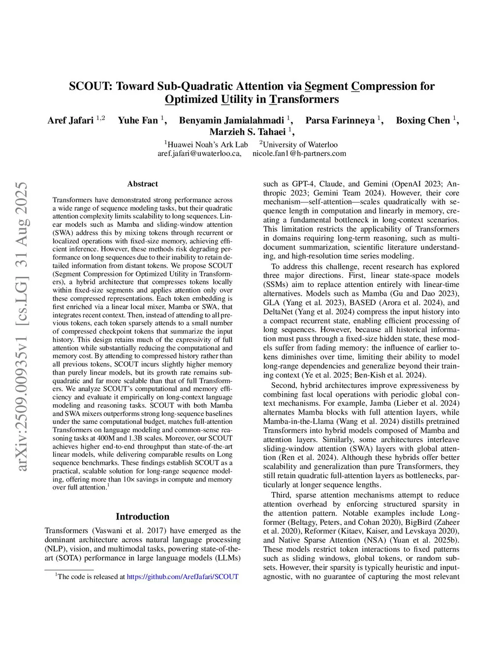 SCOUT: Toward Sub-Quadratic Attention via Segment Compression for Optimized Utility in Transformers