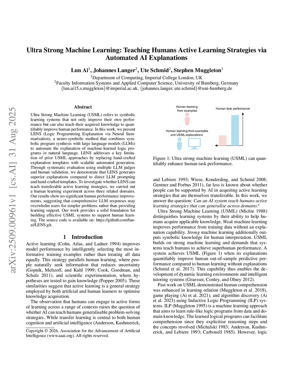 Ultra Strong Machine Learning (USML) refers to symbolic learning systems that not only improve their own performance but can also teach their acquired knowledge to quantifiably improve human performance. We introduce LENS (Logic Programming Explanation via Neural Summarisation), a neuro-symbolic framework that combines symbolic program synthesis with large language models (LLMs). This framework automatically generates natural language explanations of learned logic programs, replacing hand-crafted templates used in prior USML work. Using LLMs-as-judges evaluation and expert validation, we show that LENS produces higher-quality explanations than both direct LLM prompting and hand-crafted templates. We then examine whether LENS explanations suffice for achieving USML in a human trial teaching active learning strategies across three related domains. Our exploratory analysis suggests that concise, expert-written explanations may benefit learners with higher initial performance, while LLM-generated explanations provide no advantage over human self learning despite being rated as higher quality. This case study reveals that achieving USML requires methods grounded in human learning, where current LLM-generated explanations do not capture human cognitive constraints and LLMs-as-judges evaluations do not reflect what effectively supports human learning.