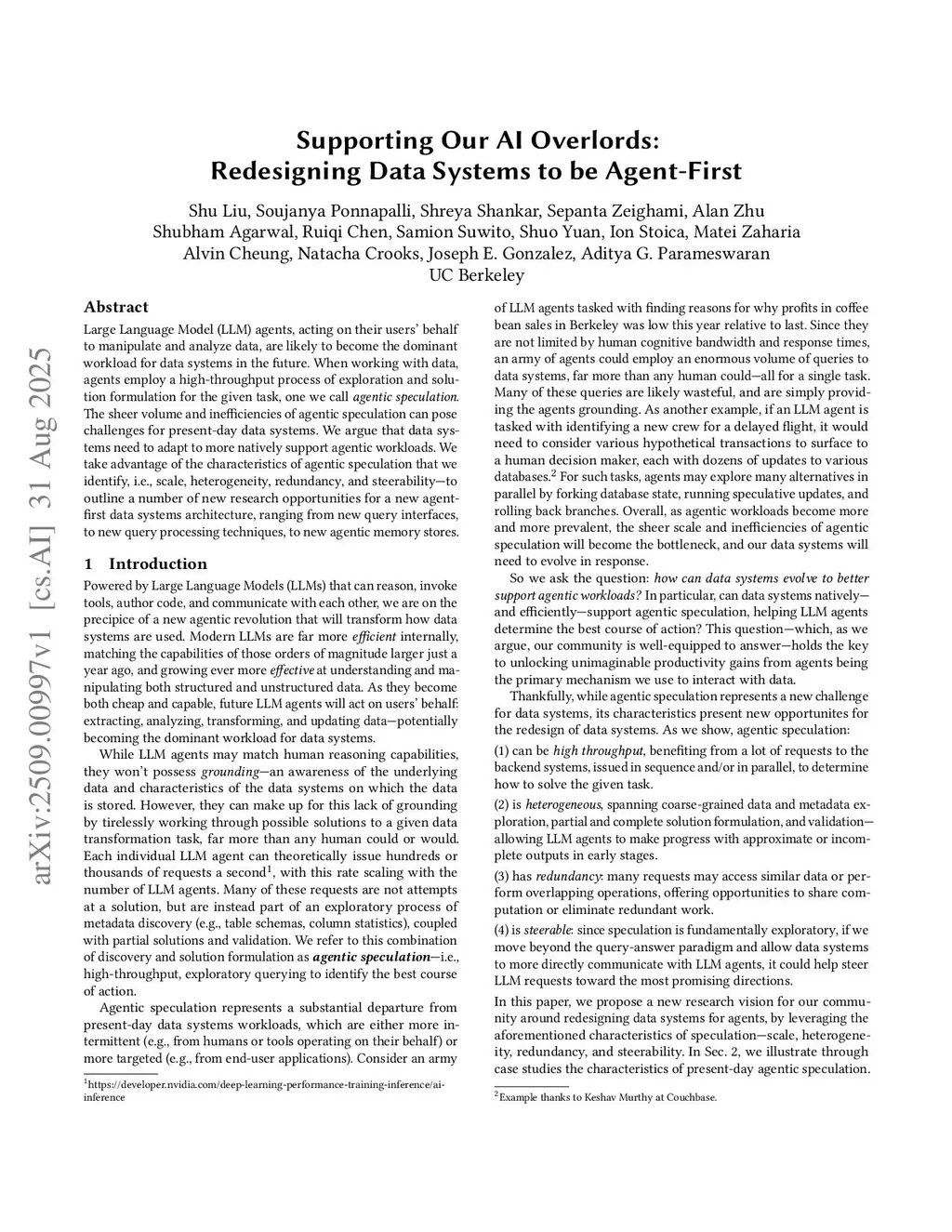 Large Language Model (LLM) agents, acting on their users' behalf to manipulate and analyze data, are likely to become the dominant workload for data systems in the future. When working with data, agents employ a high-throughput process of exploration and solution formulation for the given task, one we call agentic speculation. The sheer volume and inefficiencies of agentic speculation can pose challenges for present-day data systems. We argue that data systems need to adapt to more natively support agentic workloads. We take advantage of the characteristics of agentic speculation that we identify, i.e., scale, heterogeneity, redundancy, and steerability - to outline a number of new research opportunities for a new agent-first data systems architecture, ranging from new query interfaces, to new query processing techniques, to new agentic memory stores.