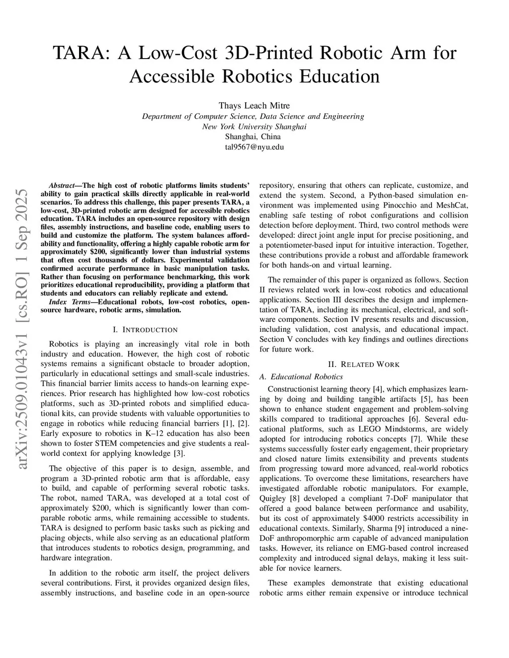 TARA: A Low-Cost 3D-Printed Robotic Arm for Accessible Robotics Education