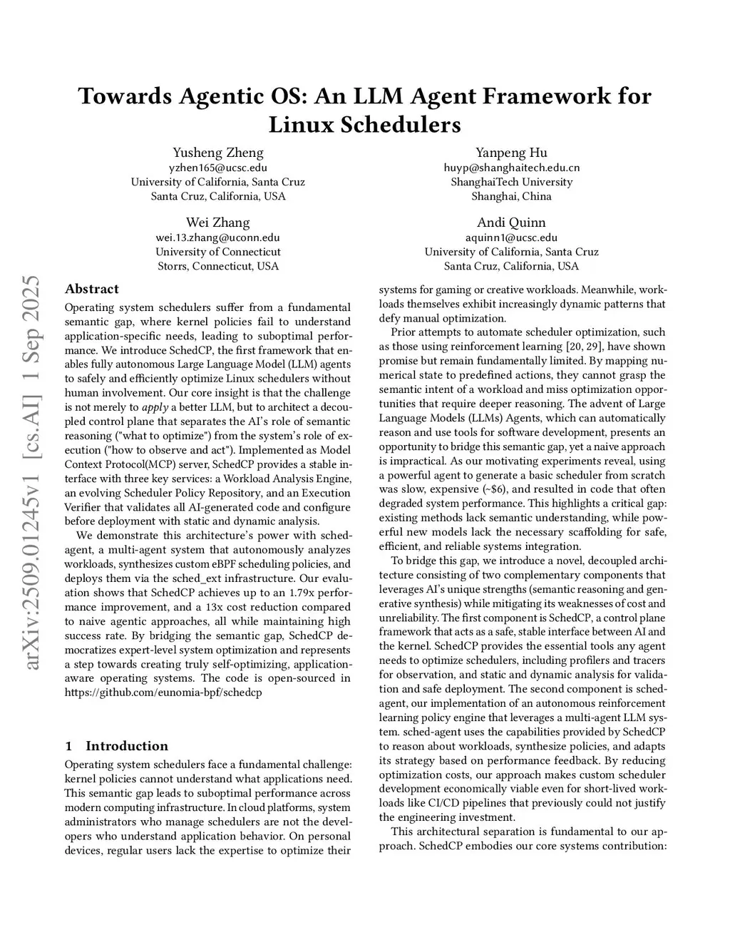 Operating system schedulers suffer from a fundamental semantic gap, where kernel policies fail to understand application-specific needs, leading to suboptimal performance. We introduce SchedCP, the first framework that enables fully autonomous Large Language Model (LLM) agents to safely and efficiently optimize Linux schedulers without human involvement. Our core insight is that the challenge is not merely to apply a better LLM, but to architect a decoupled control plane that separates the AI's role of semantic reasoning ("what to optimize") from the system's role of execution ("how to observe and act"), thereby separating the optimization problem into two stages: goal-inference and policy-synthesis. Implemented as Model Context Protocol(MCP) server, SchedCP provides a stable interface with three key services: a Workload Analysis Engine, an evolving Scheduler Policy Repository, and an Execution Verifier that validates all AI-generated code and configure before deployment with static and dynamic analysis.We demonstrate this architecture's power with sched-agent, a multi-agent system that autonomously analyzes workloads, synthesizes custom eBPF scheduling policies, and deploys them via the sched\_ext infrastructure. Our evaluation shows that SchedCP achieves up to an 1.79x performance improvement, and a 13x cost reduction compared to naive agentic approaches, all while maintaining high success rate. By bridging the semantic gap, SchedCP democratizes expert-level system optimization and represents a step towards creating truly self-optimizing, application-aware operating systems. The code is open-sourced inthis https URL