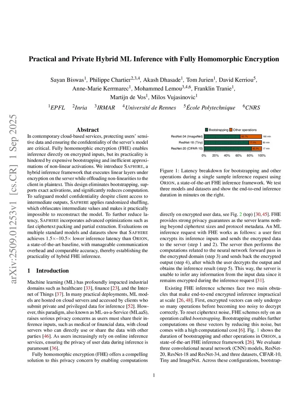 In contemporary cloud-based services, protecting users' sensitive data and ensuring the confidentiality of the server's model are critical. Fully homomorphic encryption (FHE) enables inference directly on encrypted inputs, but its practicality is hindered by expensive bootstrapping and inefficient approximations of non-linear activations. We introduce Safhire, a hybrid inference framework that executes linear layers under encryption on the server while offloading non-linearities to the client in plaintext. This design eliminates bootstrapping, supports exact activations, and significantly reduces computation. To safeguard model confidentiality despite client access to intermediate outputs, Safhire applies randomized shuffling, which obfuscates intermediate values and makes it practically impossible to reconstruct the model. To further reduce latency, Safhire incorporates advanced optimizations such as fast ciphertext packing and partial extraction. Evaluations on multiple standard models and datasets show that Safhire achieves 1.5X - 10.5X lower inference latency than Orion, a state-of-the-art baseline, with manageable communication overhead and comparable accuracy, thereby establishing the practicality of hybrid FHE inference.
