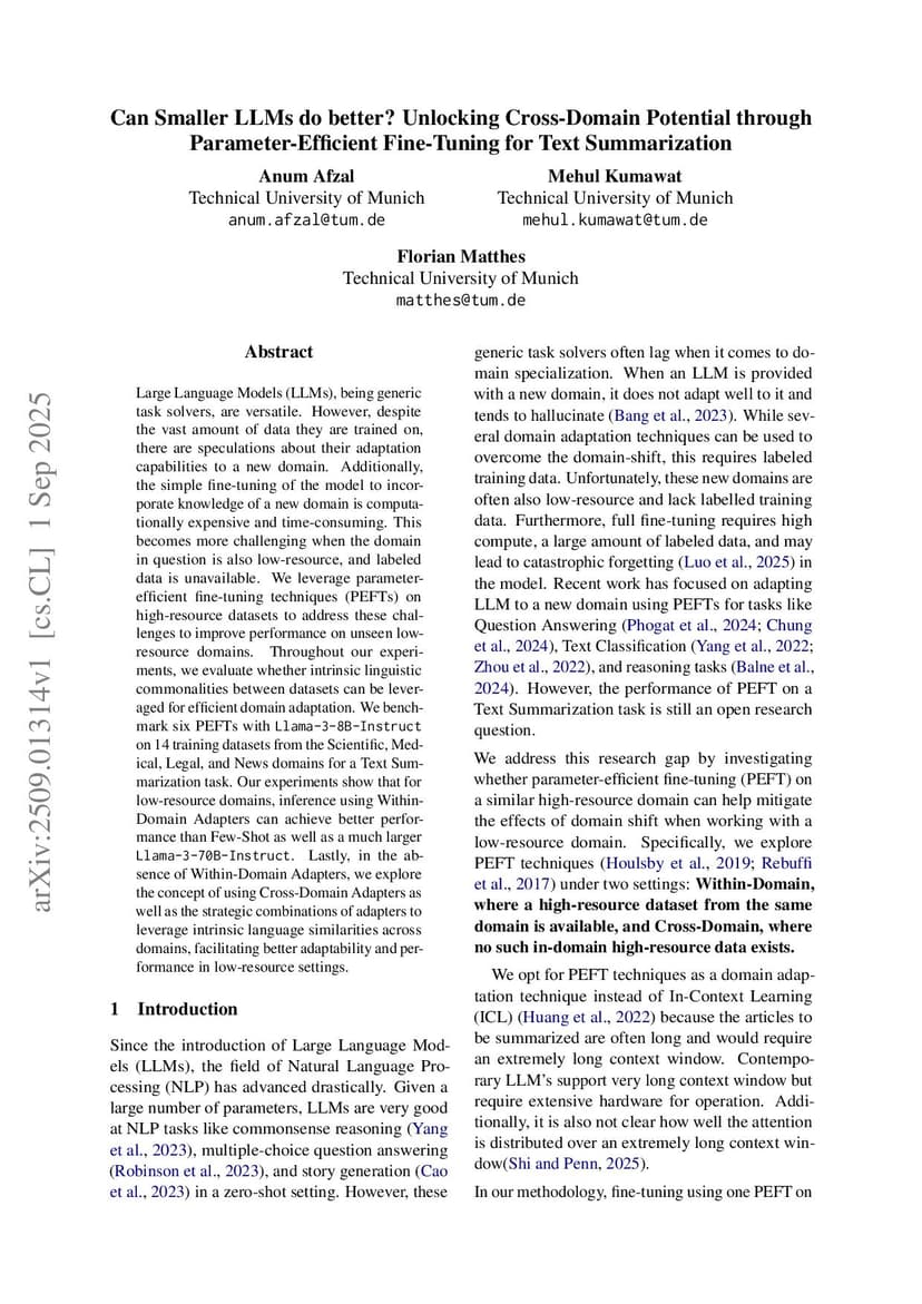 Can Smaller LLMs do better? Unlocking Cross-Domain Potential through Parameter-Efficient Fine-Tuning for Text Summarization