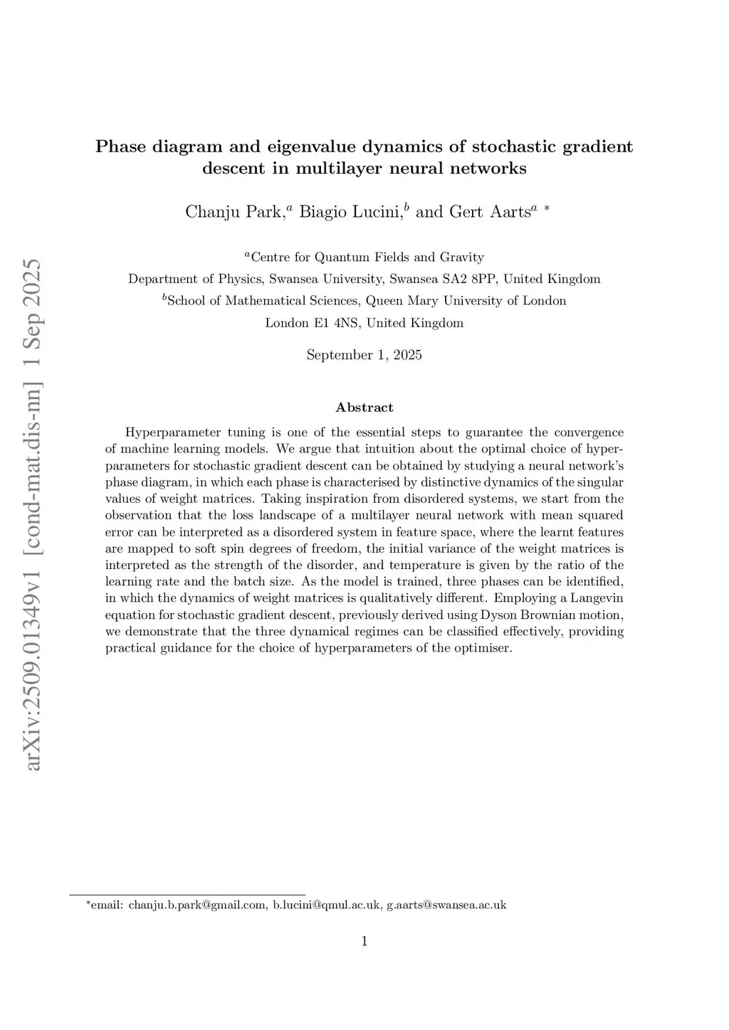 Hyperparameter tuning is one of the essential steps to guarantee the convergence of machine learning models. We argue that intuition about the optimal choice of hyperparameters for stochastic gradient descent can be obtained by studying a neural network's phase diagram, in which each phase is characterised by distinctive dynamics of the singular values of weight matrices. Taking inspiration from disordered systems, we start from the observation that the loss landscape of a multilayer neural network with mean squared error can be interpreted as a disordered system in feature space, where the learnt features are mapped to soft spin degrees of freedom, the initial variance of the weight matrices is interpreted as the strength of the disorder, and temperature is given by the ratio of the learning rate and the batch size. As the model is trained, three phases can be identified, in which the dynamics of weight matrices is qualitatively different. Employing a Langevin equation for stochastic gradient descent, previously derived using Dyson Brownian motion, we demonstrate that the three dynamical regimes can be classified effectively, providing practical guidance for the choice of hyperparameters of the optimiser.