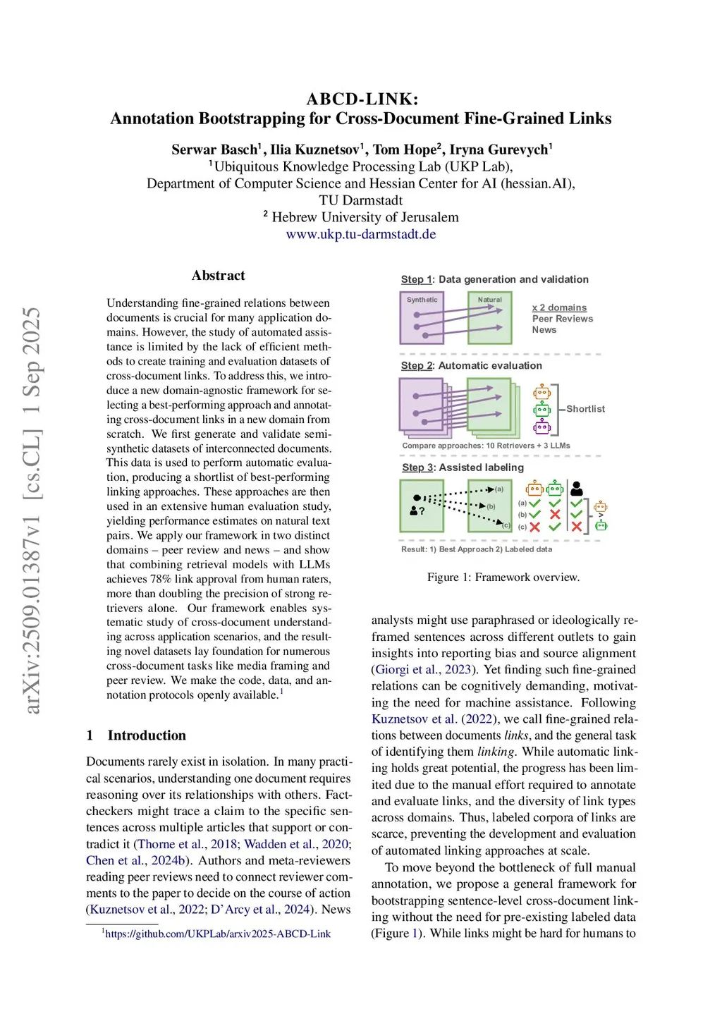 Understanding fine-grained links between documents is crucial for many applications, yet progress is limited by the lack of efficient methods for data curation. To address this limitation, we introduce a domain-agnostic framework for bootstrapping sentence-level cross-document links from scratch. Our approach (1) generates and validates semi-synthetic datasets of linked documents, (2) uses these datasets to benchmark and shortlist the best-performing linking approaches, and (3) applies the shortlisted methods in large-scale human-in-the-loop annotation of natural text pairs. We apply the framework in two distinct domains -- peer review and news -- and show that combining retrieval models with LLMs achieves a 73% human approval rate for suggested links, more than doubling the acceptance of strong retrievers alone. Our framework allows users to produce novel datasets that enable systematic study of cross-document understanding, supporting downstream tasks such as media framing analysis and peer review assessment. All code, data, and annotation protocols are released to facilitate future research.