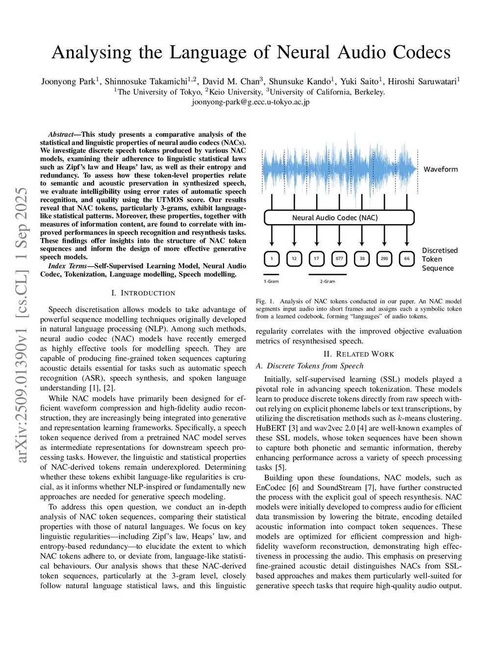 This study presents a comparative analysis of the statistical and linguistic properties of neural audio codecs (NACs). We investigate discrete speech tokens produced by various NAC models, examining their adherence to linguistic statistical laws such as Zipf's law and Heaps' law, as well as their entropy and redundancy. To assess how these token-level properties relate to semantic and acoustic preservation in synthesized speech, we evaluate intelligibility using error rates of automatic speech recognition, and quality using the UTMOS score. Our results reveal that NAC tokens, particularly 3-grams, exhibit language-like statistical patterns. Moreover, these properties, together with measures of information content, are found to correlate with improved performances in speech recognition and resynthesis tasks. These findings offer insights into the structure of NAC token sequences and inform the design of more effective generative speech models.
