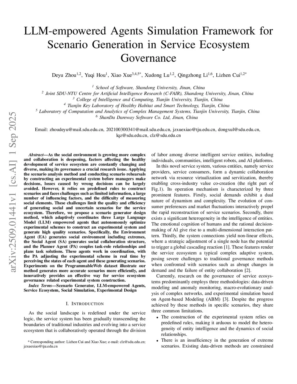 As the social environment is growing more complex and collaboration is deepening, factors affecting the healthy development of service ecosystem are constantly changing and diverse, making its governance a crucial research issue. Applying the scenario analysis method and conducting scenario rehearsals by constructing an experimental system before managers make decisions, losses caused by wrong decisions can be largely avoided. However, it relies on predefined rules to construct scenarios and faces challenges such as limited information, a large number of influencing factors, and the difficulty of measuring social elements. These challenges limit the quality and efficiency of generating social and uncertain scenarios for the service ecosystem. Therefore, we propose a scenario generator design method, which adaptively coordinates three Large Language Model (LLM) empowered agents that autonomously optimize experimental schemes to construct an experimental system and generate high quality scenarios. Specifically, the Environment Agent (EA) generates social environment including extremes, the Social Agent (SA) generates social collaboration structure, and the Planner Agent (PA) couples task-role relationships and plans task solutions. These agents work in coordination, with the PA adjusting the experimental scheme in real time by perceiving the states of each agent and these generating scenarios. Experiments on the ProgrammableWeb dataset illustrate our method generates more accurate scenarios more efficiently, and innovatively provides an effective way for service ecosystem governance related experimental system construction.