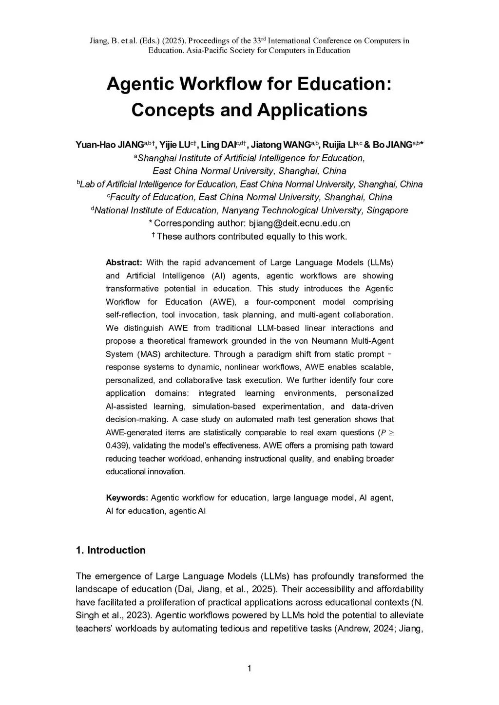 With the rapid advancement of Large Language Models (LLMs) and Artificial Intelligence (AI) agents, agentic workflows are showing transformative potential in education. This study introduces the Agentic Workflow for Education (AWE), a four-component model comprising self-reflection, tool invocation, task planning, and multi-agent collaboration. We distinguish AWE from traditional LLM-based linear interactions and propose a theoretical framework grounded in the von Neumann Multi-Agent System (MAS) architecture. Through a paradigm shift from static prompt-response systems to dynamic, nonlinear workflows, AWE enables scalable, personalized, and collaborative task execution. We further identify four core application domains: integrated learning environments, personalized AI-assisted learning, simulation-based experimentation, and data-driven decision-making. A case study on automated math test generation shows that AWE-generated items are statistically comparable to real exam questions, validating the model's effectiveness. AWE offers a promising path toward reducing teacher workload, enhancing instructional quality, and enabling broader educational innovation.