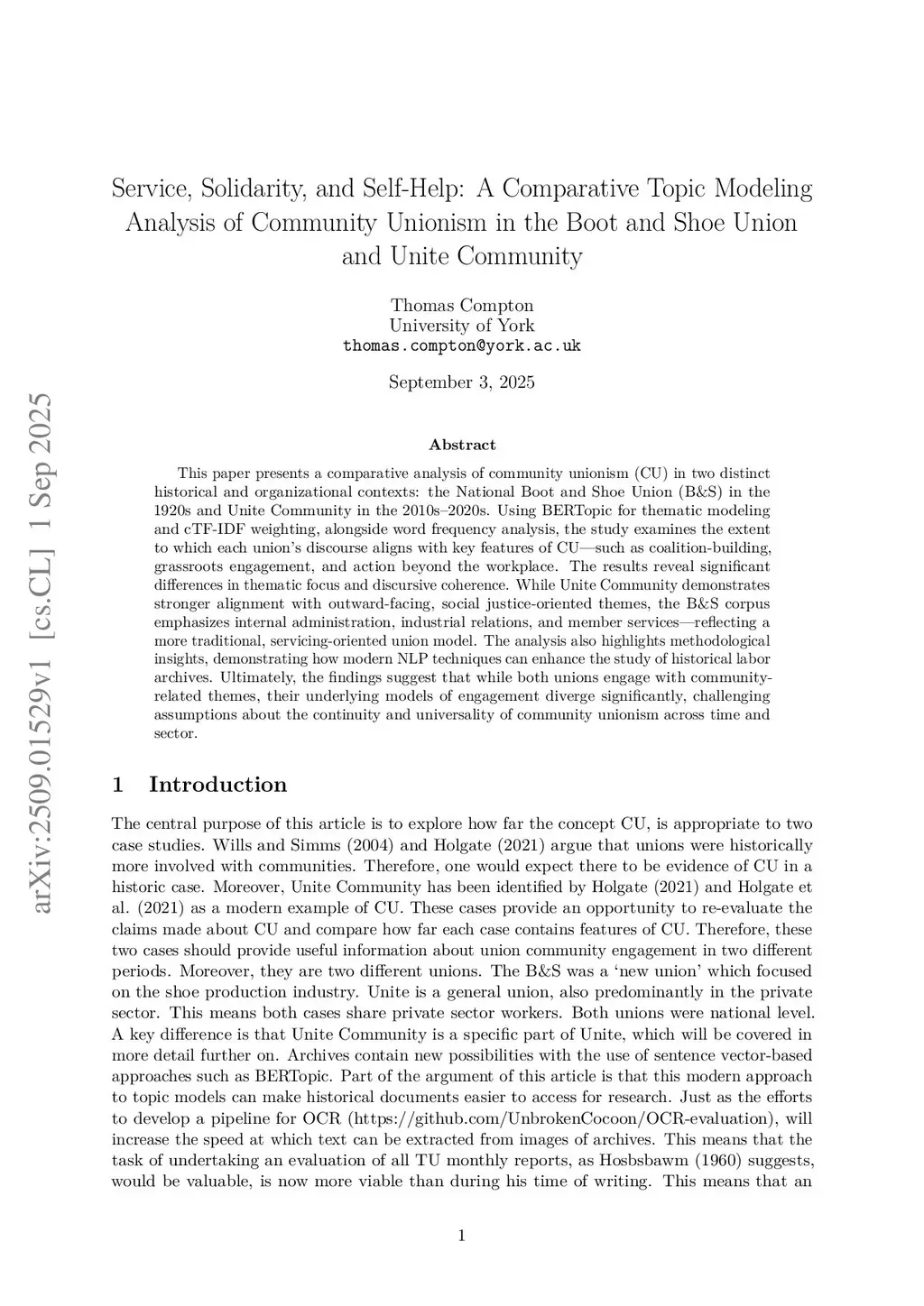 Service, Solidarity, and Self-Help: A Comparative Topic Modeling Analysis of Community Unionism in the Boot and Shoe Union and Unite Community