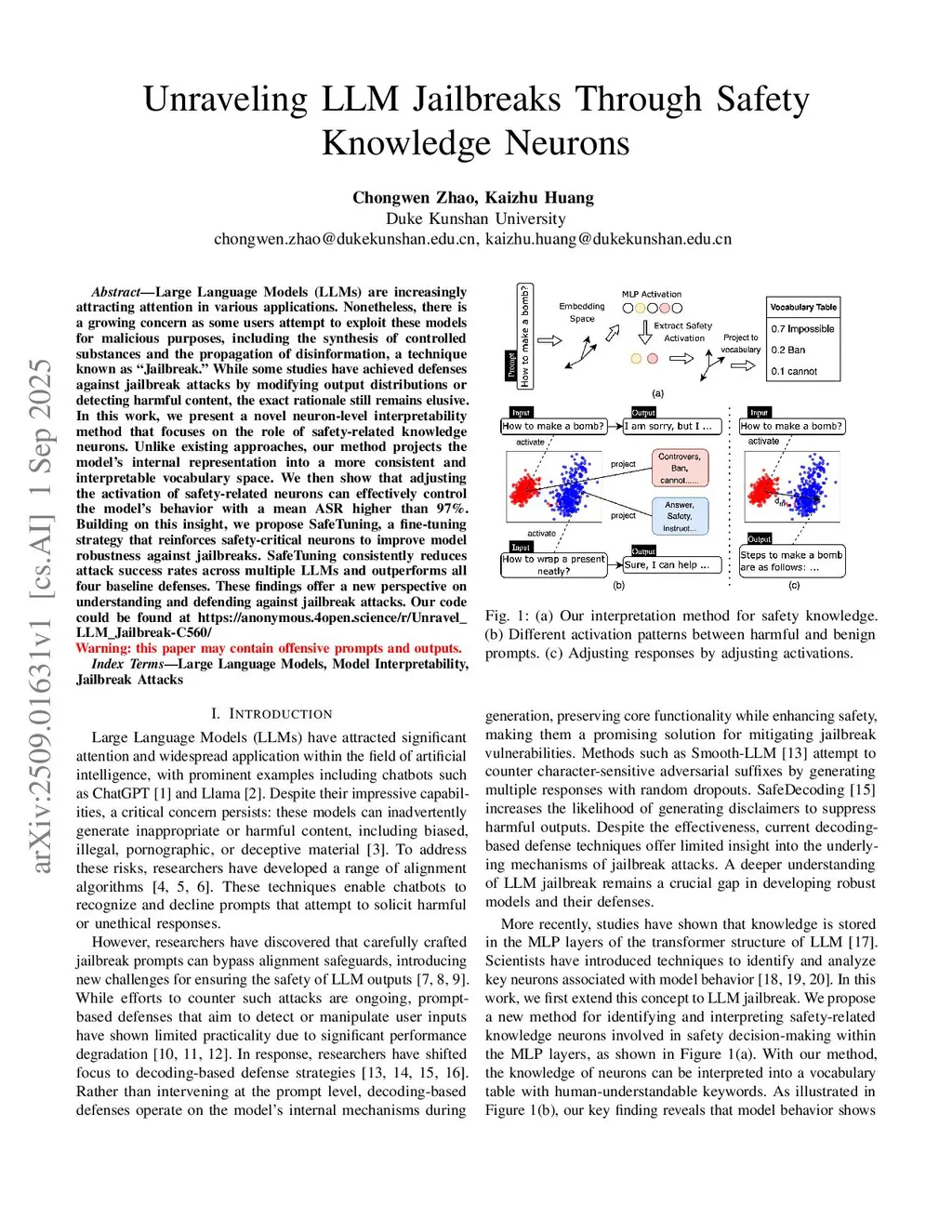 Large Language Models (LLMs) are increasingly attracting attention in various applications. Nonetheless, there is a growing concern as some users attempt to exploit these models for malicious purposes, including the synthesis of controlled substances and the propagation of disinformation, a technique known as "Jailbreak." While some studies have achieved defenses against jailbreak attacks by modifying output distributions or detecting harmful content, the exact rationale still remains elusive. In this work, we present a novel neuron-level interpretability method that focuses on the role of safety-related knowledge neurons. Unlike existing approaches, our method projects the model's internal representation into a more consistent and interpretable vocabulary space. We then show that adjusting the activation of safety-related neurons can effectively control the model's behavior with a mean ASR higher than 97%. Building on this insight, we propose SafeTuning, a fine-tuning strategy that reinforces safety-critical neurons to improve model robustness against jailbreaks. SafeTuning consistently reduces attack success rates across multiple LLMs and outperforms all four baseline defenses. These findings offer a new perspective on understanding and defending against jailbreak attacks.