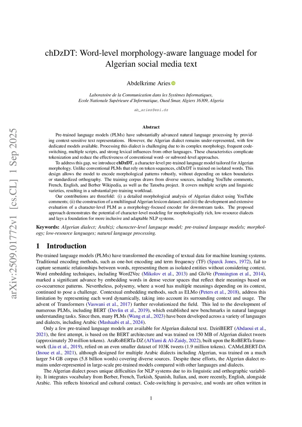 chDzDT: Word-level morphology-aware language model for Algerian social media text