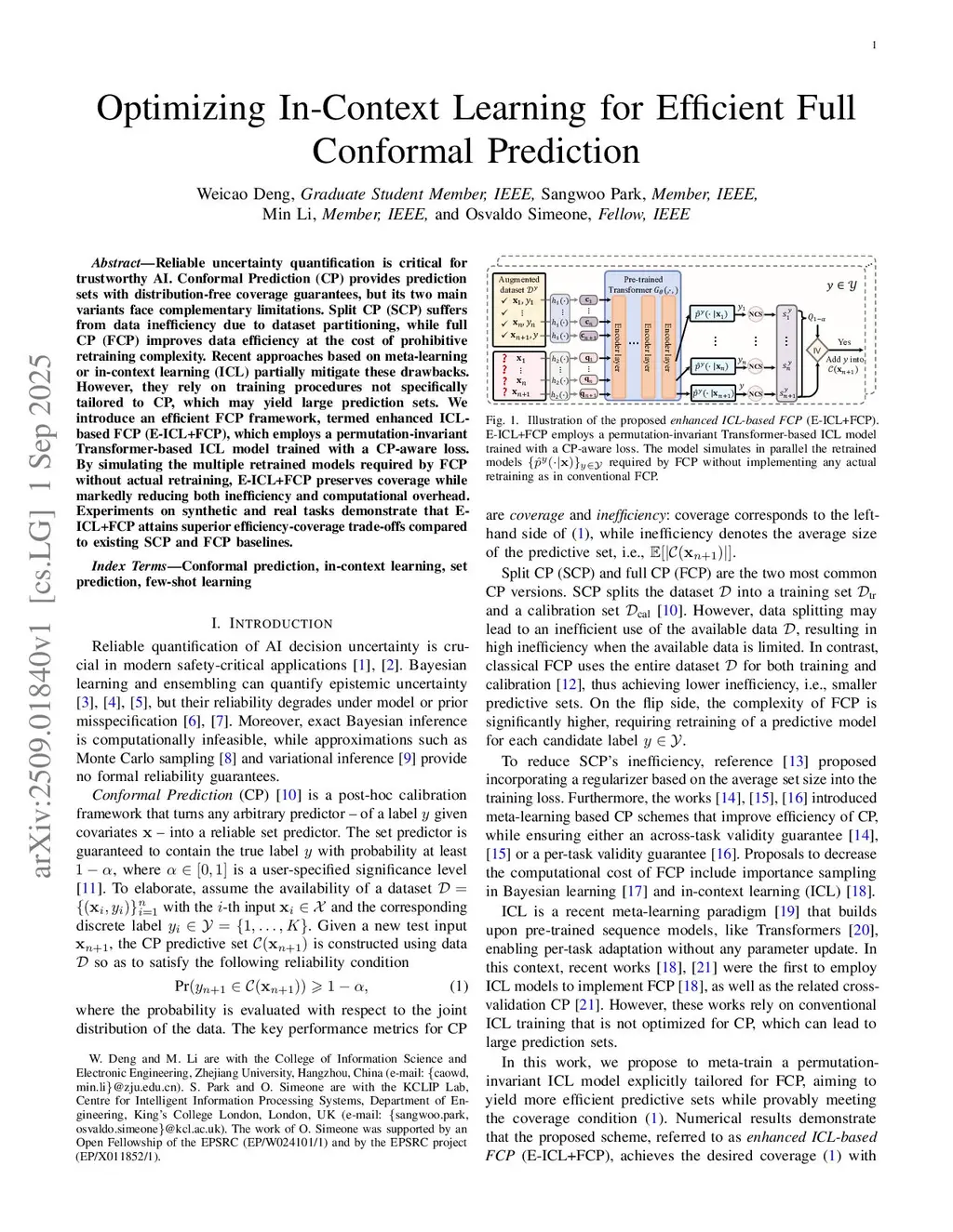 Reliable uncertainty quantification is critical for trustworthy AI. Conformal Prediction (CP) provides prediction sets with distribution-free coverage guarantees, but its two main variants face complementary limitations. Split CP (SCP) suffers from data inefficiency due to dataset partitioning, while full CP (FCP) improves data efficiency at the cost of prohibitive retraining complexity. Recent approaches based on meta-learning or in-context learning (ICL) partially mitigate these drawbacks. However, they rely on training procedures not specifically tailored to CP, which may yield large prediction sets. We introduce an efficient FCP framework, termed enhanced ICL-based FCP (E-ICL+FCP), which employs a permutation-invariant Transformer-based ICL model trained with a CP-aware loss. By simulating the multiple retrained models required by FCP without actual retraining, E-ICL+FCP preserves coverage while markedly reducing both inefficiency and computational overhead. Experiments on synthetic and real tasks demonstrate that E-ICL+FCP attains superior efficiency-coverage trade-offs compared to existing SCP and FCP baselines.