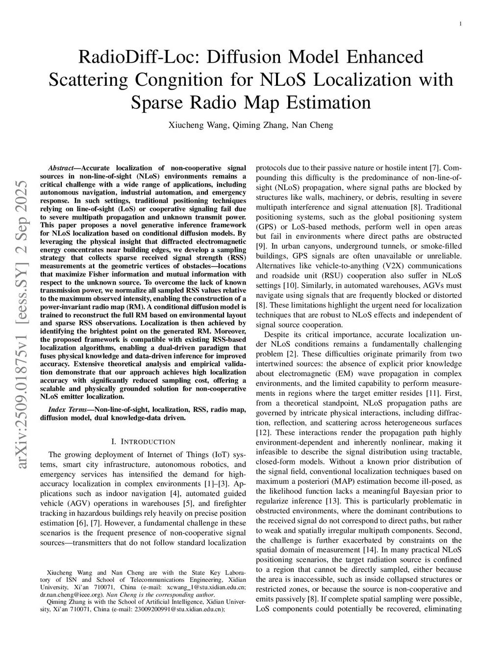 Accurate localization of non-cooperative signal sources in non-line-of-sight (NLoS) environments remains a critical challenge with a wide range of applications, including autonomous navigation, industrial automation, and emergency response. In such settings, traditional positioning techniques relying on line-of-sight (LoS) or cooperative signaling fail due to severe multipath propagation and unknown transmit power. This paper proposes a novel generative inference framework for NLoS localization based on conditional diffusion models. By leveraging the physical insight that diffracted electromagnetic energy concentrates near building edges, we develop a sampling strategy that collects sparse received signal strength (RSS) measurements at the geometric vertices of obstacles--locations that maximize Fisher information and mutual information with respect to the unknown source. To overcome the lack of known transmission power, we normalize all sampled RSS values relative to the maximum observed intensity, enabling the construction of a power-invariant radio map (RM). A conditional diffusion model is trained to reconstruct the full RM based on environmental layout and sparse RSS observations. Localization is then achieved by identifying the brightest point on the generated RM. Moreover, the proposed framework is compatible with existing RSS-based localization algorithms, enabling a dual-driven paradigm that fuses physical knowledge and data-driven inference for improved accuracy. Extensive theoretical analysis and empirical validation demonstrate that our approach achieves high localization accuracy with significantly reduced sampling cost, offering a scalable and physically grounded solution for non-cooperative NLoS emitter localization.