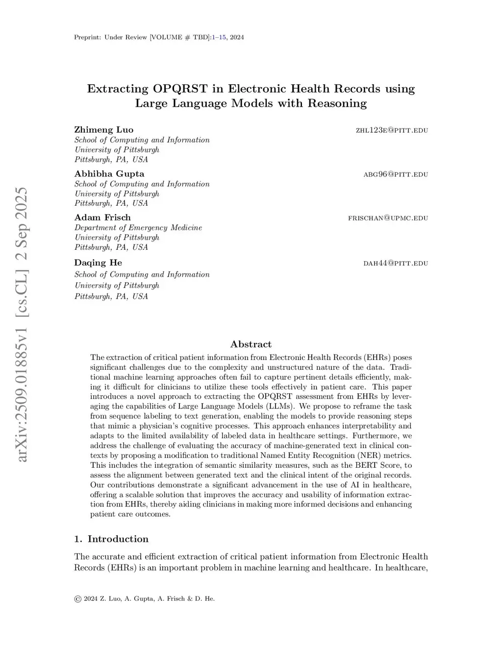 The extraction of critical patient information from Electronic Health Records (EHRs) poses significant challenges due to the complexity and unstructured nature of the data. Traditional machine learning approaches often fail to capture pertinent details efficiently, making it difficult for clinicians to utilize these tools effectively in patient care. This paper introduces a novel approach to extracting the OPQRST assessment from EHRs by leveraging the capabilities of Large Language Models (LLMs). We propose to reframe the task from sequence labeling to text generation, enabling the models to provide reasoning steps that mimic a physician's cognitive processes. This approach enhances interpretability and adapts to the limited availability of labeled data in healthcare settings. Furthermore, we address the challenge of evaluating the accuracy of machine-generated text in clinical contexts by proposing a modification to traditional Named Entity Recognition (NER) metrics. This includes the integration of semantic similarity measures, such as the BERT Score, to assess the alignment between generated text and the clinical intent of the original records. Our contributions demonstrate a significant advancement in the use of AI in healthcare, offering a scalable solution that improves the accuracy and usability of information extraction from EHRs, thereby aiding clinicians in making more informed decisions and enhancing patient care outcomes.