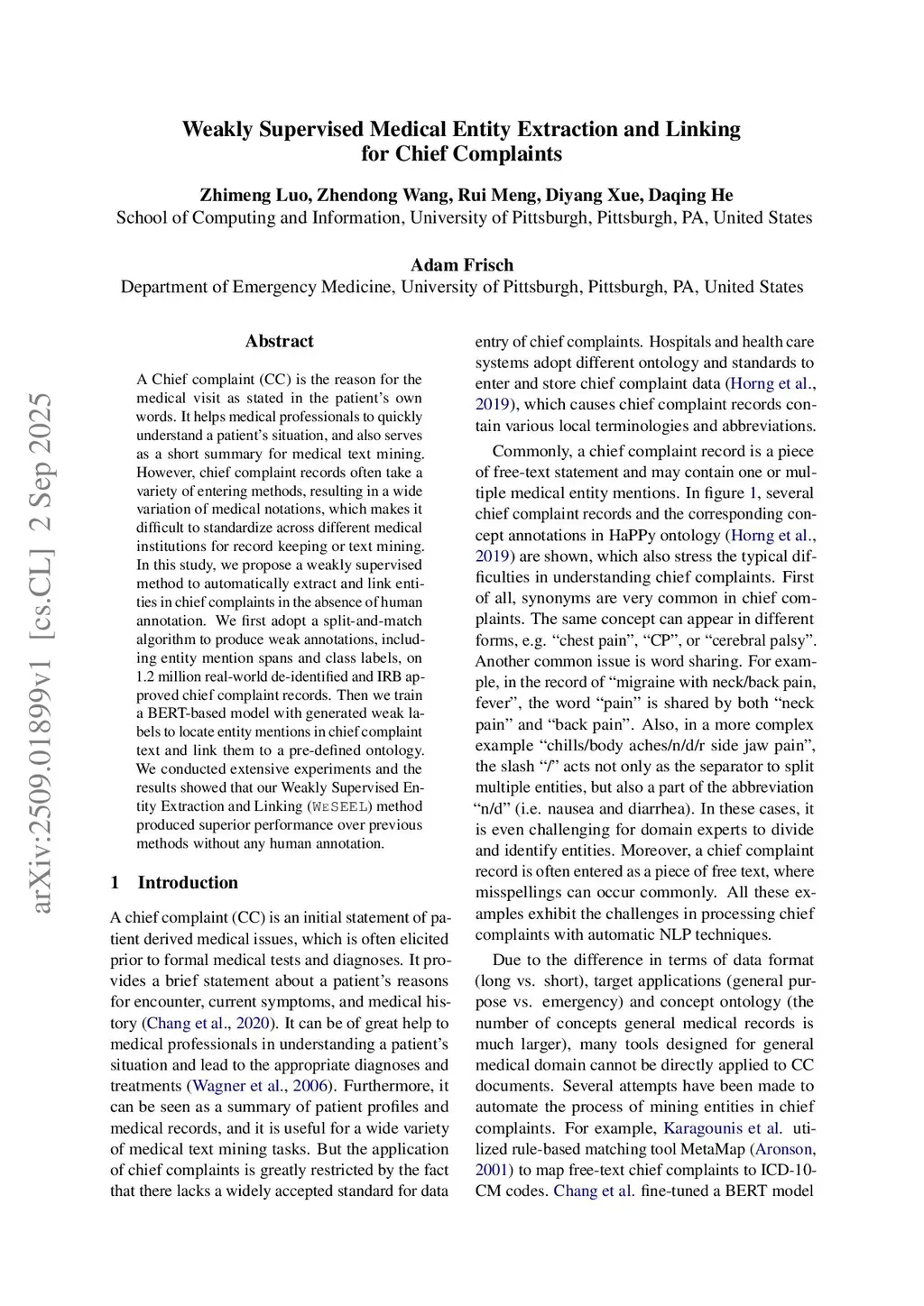 Weakly Supervised Medical Entity Extraction and Linking for Chief Complaints