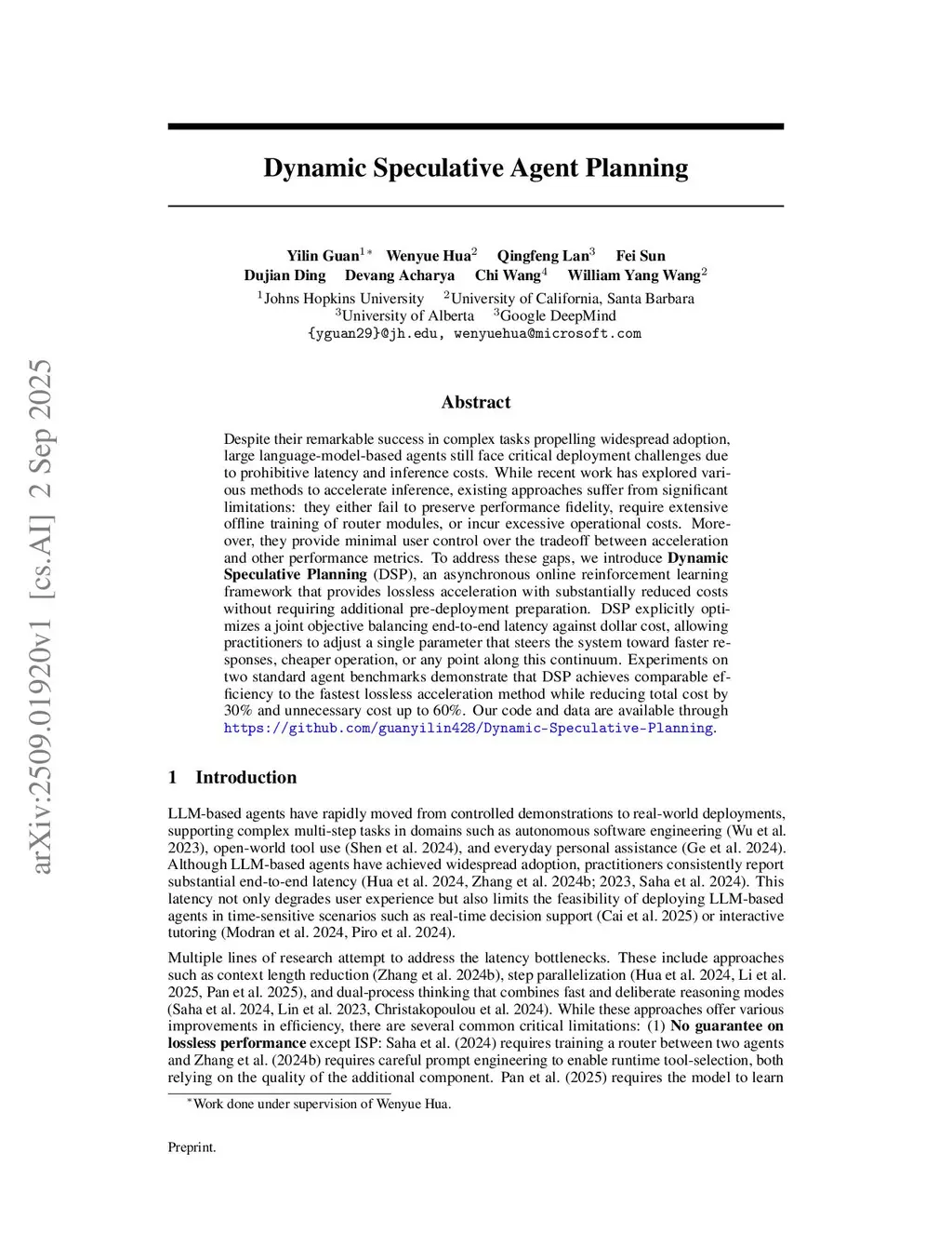 Despite their remarkable success in complex tasks propelling widespread adoption, large language-model-based agents still face critical deployment challenges due to prohibitive latency and inference costs. While recent work has explored various methods to accelerate inference, existing approaches suffer from significant limitations: they either fail to preserve performance fidelity, require extensive offline training of router modules, or incur excessive operational costs. Moreover, they provide minimal user control over the tradeoff between acceleration and other performance metrics. To address these gaps, we introduce Dynamic Speculative Planning (DSP), an asynchronous online reinforcement learning framework that provides lossless acceleration with substantially reduced costs without requiring additional pre-deployment preparation. DSP explicitly optimizes a joint objective balancing end-to-end latency against dollar cost, allowing practitioners to adjust a single parameter that steers the system toward faster responses, cheaper operation, or any point along this continuum. Experiments on two standard agent benchmarks demonstrate that DSP achieves comparable efficiency to the fastest lossless acceleration method while reducing total cost by 30% and unnecessary cost up to 60%. Our code and data are available throughthis https URL.