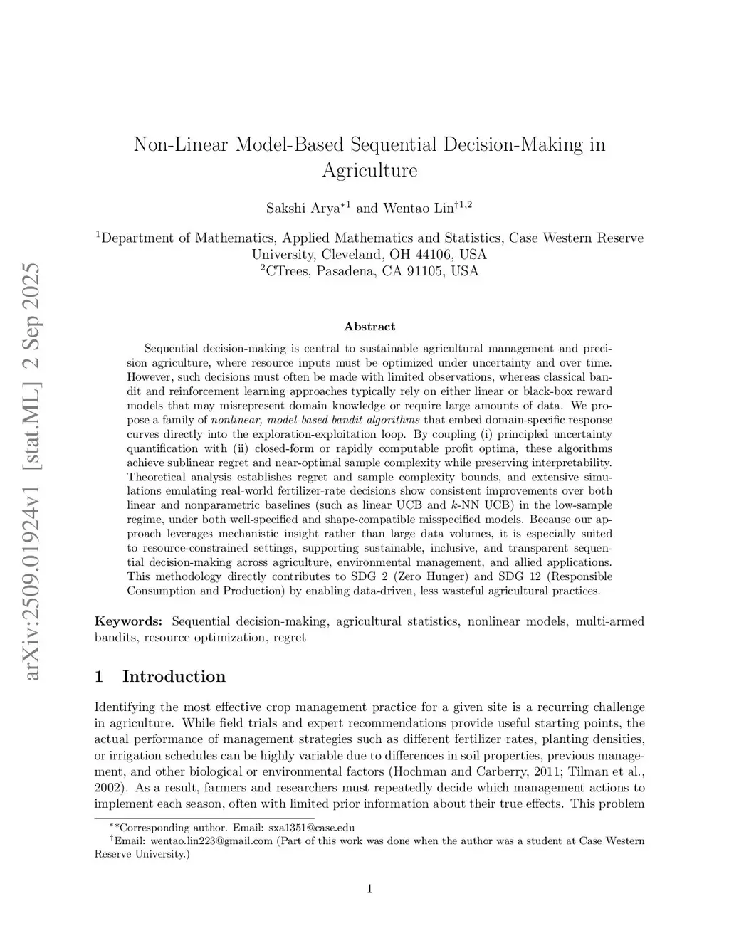 Sequential decision-making is central to sustainable agricultural management and precision agriculture, where resource inputs must be optimized under uncertainty and over time. However, such decisions must often be made with limited observations, whereas classical bandit and reinforcement learning approaches typically rely on either linear or black-box reward models that may misrepresent domain knowledge or require large amounts of data. We propose a family of \emph{nonlinear, model-based bandit algorithms} that embed domain-specific response curves directly into the exploration-exploitation loop. By coupling (i) principled uncertainty quantification with (ii) closed-form or rapidly computable profit optima, these algorithms achieve sublinear regret and near-optimal sample complexity while preserving interpretability. Theoretical analysis establishes regret and sample complexity bounds, and extensive simulations emulating real-world fertilizer-rate decisions show consistent improvements over both linear and nonparametric baselines (such as linear UCB and -NN UCB) in the low-sample regime, under both well-specified and shape-compatible misspecified models. Because our approach leverages mechanistic insight rather than large data volumes, it is especially suited to resource-constrained settings, supporting sustainable, inclusive, and transparent sequential decision-making across agriculture, environmental management, and allied applications.