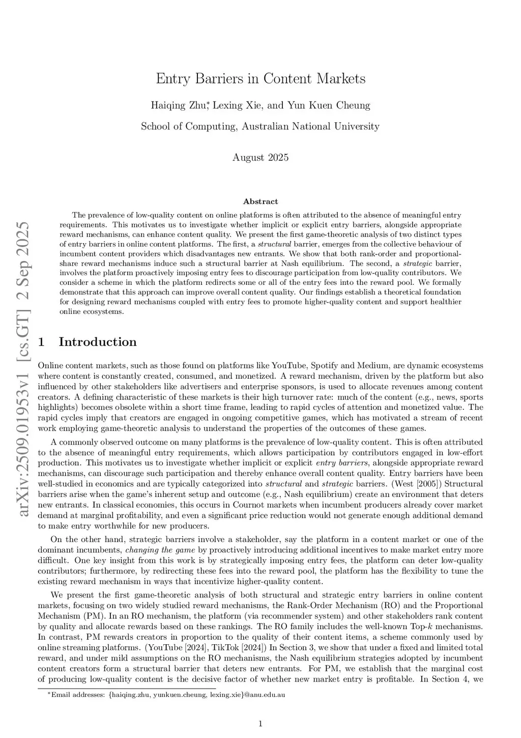 The prevalence of low-quality content on online platforms is often attributed to the absence of meaningful entry requirements. This motivates us to investigate whether implicit or explicit entry barriers, alongside appropriate reward mechanisms, can enhance content quality. We present the first game-theoretic analysis of two distinct types of entry barriers in online content platforms. The first, a structural barrier, emerges from the collective behaviour of incumbent content providers which disadvantages new entrants. We show that both rank-order and proportional-share reward mechanisms induce such a structural barrier at Nash equilibrium. The second, a strategic barrier, involves the platform proactively imposing entry fees to discourage participation from low-quality contributors. We consider a scheme in which the platform redirects some or all of the entry fees into the reward pool. We formally demonstrate that this approach can improve overall content quality. Our findings establish a theoretical foundation for designing reward mechanisms coupled with entry fees to promote higher-quality content and support healthier online ecosystems.