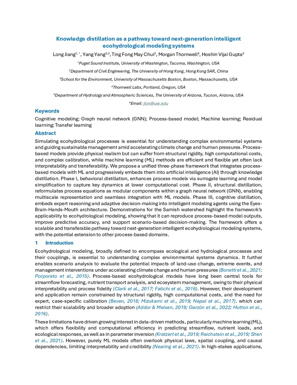 Simulating ecohydrological processes is essential for understanding complex environmental systems and guiding sustainable management amid accelerating climate change and human pressures. Process-based models provide physical realism but can suffer from structural rigidity, high computational costs, and complex calibration, while machine learning (ML) methods are efficient and flexible yet often lack interpretability and transferability. We propose a unified three-phase framework that integrates process-based models with ML and progressively embeds them into artificial intelligence (AI) through knowledge distillation. Phase I, behavioral distillation, enhances process models via surrogate learning and model simplification to capture key dynamics at lower computational cost. Phase II, structural distillation, reformulates process equations as modular components within a graph neural network (GNN), enabling multiscale representation and seamless integration with ML models. Phase III, cognitive distillation, embeds expert reasoning and adaptive decision-making into intelligent modeling agents using the Eyes-Brain-Hands-Mouth architecture. Demonstrations for the Samish watershed highlight the framework's applicability to ecohydrological modeling, showing that it can reproduce process-based model outputs, improve predictive accuracy, and support scenario-based decision-making. The framework offers a scalable and transferable pathway toward next-generation intelligent ecohydrological modeling systems, with the potential extension to other process-based domains.