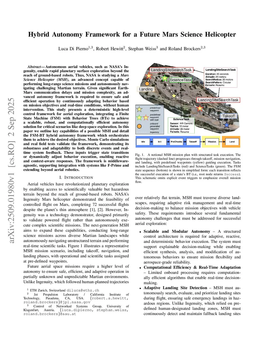 Autonomous aerial vehicles, such as NASA's Ingenuity, enable rapid planetary surface exploration beyond the reach of ground-based robots. Thus, NASA is studying a Mars Science Helicopter (MSH), an advanced concept capable of performing long-range science missions and autonomously navigating challenging Martian terrain. Given significant Earth-Mars communication delays and mission complexity, an advanced autonomy framework is required to ensure safe and efficient operation by continuously adapting behavior based on mission objectives and real-time conditions, without human intervention. This study presents a deterministic high-level control framework for aerial exploration, integrating a Finite State Machine (FSM) with Behavior Trees (BTs) to achieve a scalable, robust, and computationally efficient autonomy solution for critical scenarios like deep space exploration. In this paper we outline key capabilities of a possible MSH and detail the FSM-BT hybrid autonomy framework which orchestrates them to achieve the desired objectives. Monte Carlo simulations and real field tests validate the framework, demonstrating its robustness and adaptability to both discrete events and real-time system feedback. These inputs trigger state transitions or dynamically adjust behavior execution, enabling reactive and context-aware responses. The framework is middleware-agnostic, supporting integration with systems like F-Prime and extending beyond aerial robotics.