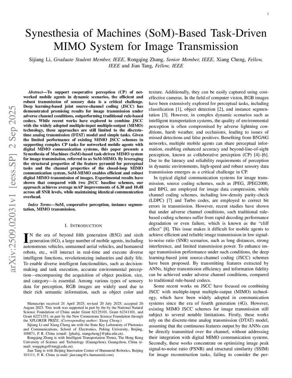 To support cooperative perception (CP) of networked mobile agents in dynamic scenarios, the efficient and robust transmission of sensory data is a critical challenge. Deep learning-based joint source-channel coding (JSCC) has demonstrated promising results for image transmission under adverse channel conditions, outperforming traditional rule-based codecs. While recent works have explored to combine JSCC with the widely adopted multiple-input multiple-output (MIMO) technology, these approaches are still limited to the discrete-time analog transmission (DTAT) model and simple tasks. Given the limited performance of existing MIMO JSCC schemes in supporting complex CP tasks for networked mobile agents with digital MIMO communication systems, this paper presents a Synesthesia of Machines (SoM)-based task-driven MIMO system for image transmission, referred to as SoM-MIMO. By leveraging the structural properties of the feature pyramid for perceptual tasks and the channel properties of the closed-loop MIMO communication system, SoM-MIMO enables efficient and robust digital MIMO transmission of images. Experimental results have shown that compared with two JSCC baseline schemes, our approach achieves average mAP improvements of 6.30 and 10.48 across all SNR levels, while maintaining identical communication overhead.
