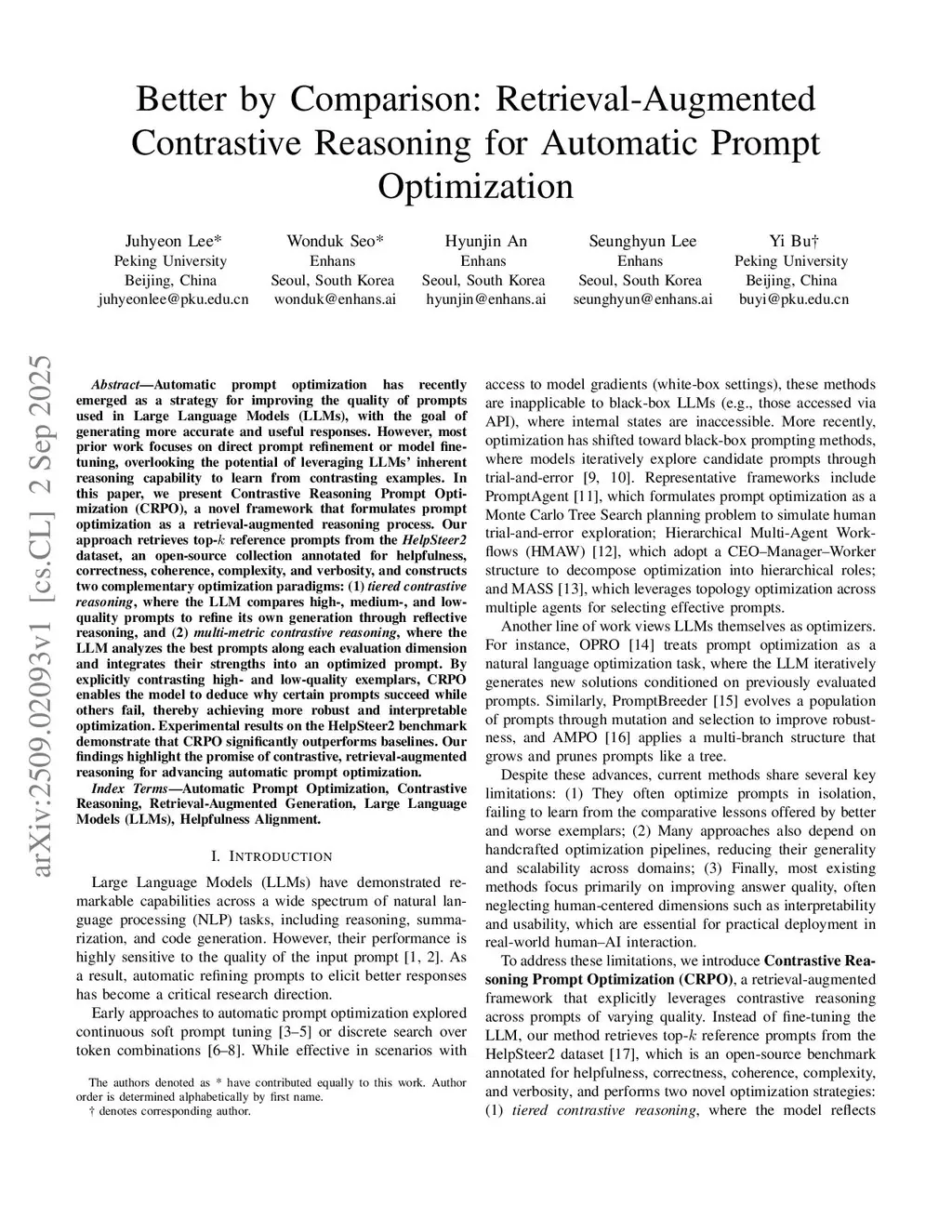 Automatic prompt optimization has recently emerged as a strategy for improving the quality of prompts used in Large Language Models (LLMs), with the goal of generating more accurate and useful responses. However, most prior work focuses on direct prompt refinement or model fine-tuning, overlooking the potential of leveraging LLMs' inherent reasoning capability to learn from contrasting examples. In this paper, we present Contrastive Reasoning Prompt Optimization (CRPO), a novel framework that formulates prompt optimization as a retrieval augmented reasoning process. Our approach retrieves top k reference prompts from the HelpSteer2 dataset, an open-source collection annotated for helpfulness, correctness, coherence, complexity, and verbosity, and constructs two complementary optimization paradigms: (1) tiered contrastive reasoning, where the LLM compares high, medium, and low quality prompts to refine its own generation through reflective reasoning, and (2) multi-metric contrastive reasoning, where the LLM analyzes the best prompts along each evaluation dimension and integrates their strengths into an optimized prompt. By explicitly contrasting high and low quality exemplars, CRPO enables the model to deduce why certain prompts succeed while others fail, thereby achieving more robust and interpretable optimization. Experimental results on the HelpSteer2 benchmark demonstrate that CRPO significantly outperforms baselines. Our findings highlight the promise of contrastive, retrieval-augmented reasoning for advancing automatic prompt optimization.