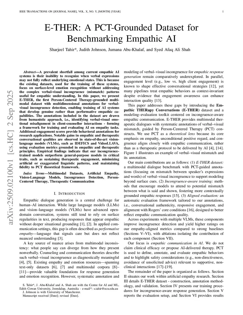 A prevalent shortfall among current empathic AI systems is their inability to recognize when verbal expressions may not fully reflect underlying emotional states. This is because the existing datasets, used for the training of these systems, focus on surface-level emotion recognition without addressing the complex verbal-visual incongruence (mismatch) patterns useful for empathic understanding. In this paper, we present E-THER, the first Person-Centered Therapy-grounded multimodal dataset with multidimensional annotations for verbal-visual incongruence detection, enabling training of AI systems that develop genuine rather than performative empathic capabilities. The annotations included in the dataset are drawn from humanistic approach, i.e., identifying verbal-visual emotional misalignment in client-counsellor interactions - forming a framework for training and evaluating AI on empathy tasks. Additional engagement scores provide behavioral annotations for research applications. Notable gains in empathic and therapeutic conversational qualities are observed in state-of-the-art vision-language models (VLMs), such as IDEFICS and VideoLLAVA, using evaluation metrics grounded in empathic and therapeutic principles. Empirical findings indicate that our incongruence-trained models outperform general-purpose models in critical traits, such as sustaining therapeutic engagement, minimizing artificial or exaggerated linguistic patterns, and maintaining fidelity to PCT theoretical framework.