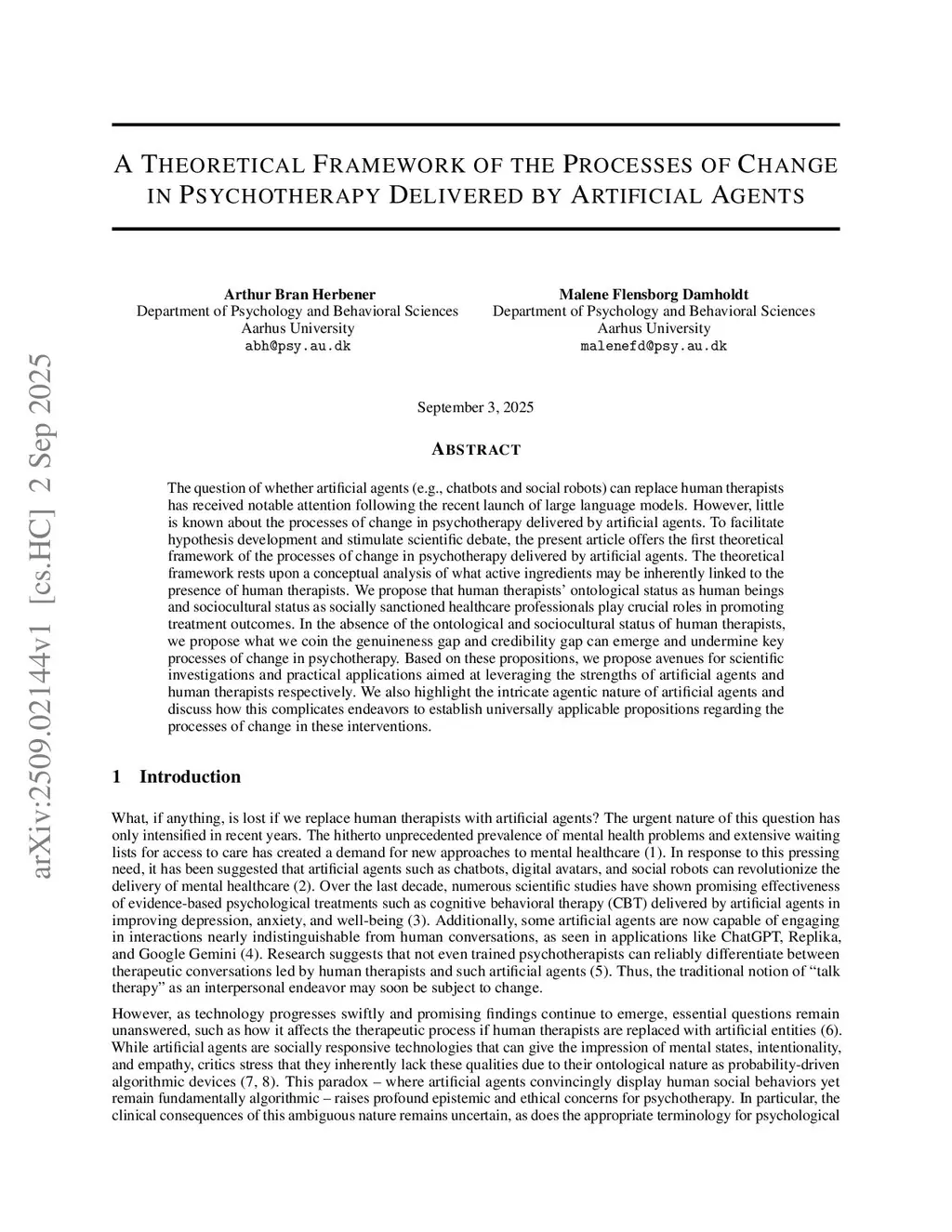 The question of whether artificial agents (e.g., chatbots and social robots) can replace human therapists has received notable attention following the recent launch of large language models. However, little is known about the processes of change in psychotherapy delivered by artificial agents. To facilitate hypothesis development and stimulate scientific debate, the present article offers the first theoretical framework of the processes of change in psychotherapy delivered by artificial agents. The theoretical framework rests upon a conceptual analysis of what active ingredients may be inherently linked to the presence of human therapists. We propose that human therapists' ontological status as human beings and sociocultural status as socially sanctioned healthcare professionals play crucial roles in promoting treatment outcomes. In the absence of the ontological and sociocultural status of human therapists, we propose what we coin the genuineness gap and credibility gap can emerge and undermine key processes of change in psychotherapy. Based on these propositions, we propose avenues for scientific investigations and practical applications aimed at leveraging the strengths of artificial agents and human therapists respectively. We also highlight the intricate agentic nature of artificial agents and discuss how this complicates endeavors to establish universally applicable propositions regarding the processes of change in these interventions.