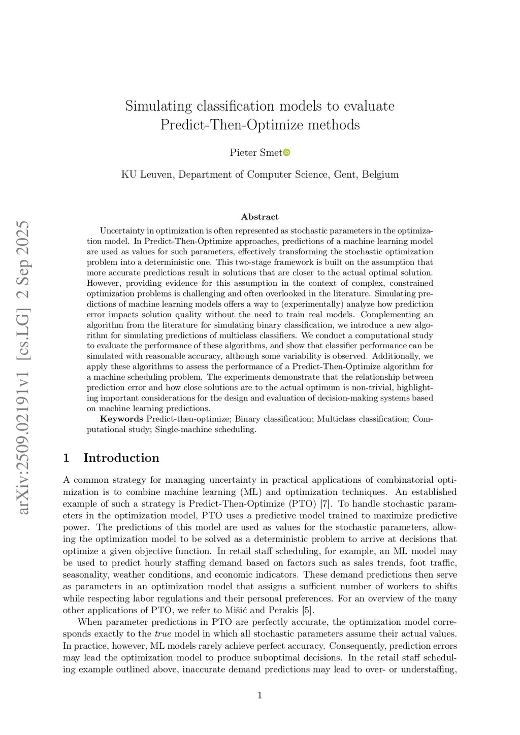 Uncertainty in optimization is often represented as stochastic parameters in the optimization model. In Predict-Then-Optimize approaches, predictions of a machine learning model are used as values for such parameters, effectively transforming the stochastic optimization problem into a deterministic one. This two-stage framework is built on the assumption that more accurate predictions result in solutions that are closer to the actual optimal solution. However, providing evidence for this assumption in the context of complex, constrained optimization problems is challenging and often overlooked in the literature. Simulating predictions of machine learning models offers a way to (experimentally) analyze how prediction error impacts solution quality without the need to train real models. Complementing an algorithm from the literature for simulating binary classification, we introduce a new algorithm for simulating predictions of multiclass classifiers. We conduct a computational study to evaluate the performance of these algorithms, and show that classifier performance can be simulated with reasonable accuracy, although some variability is observed. Additionally, we apply these algorithms to assess the performance of a Predict-Then-Optimize algorithm for a machine scheduling problem. The experiments demonstrate that the relationship between prediction error and how close solutions are to the actual optimum is non-trivial, highlighting important considerations for the design and evaluation of decision-making systems based on machine learning predictions.