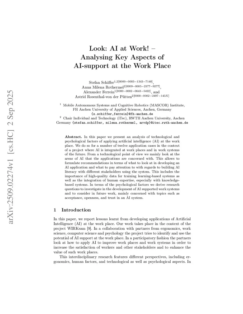In this paper we present an analysis of technological and psychological factors of applying artificial intelligence (AI) at the work place. We do so for a number of twelve application cases in the context of a project where AI is integrated at work places and in work systems of the future. From a technological point of view we mainly look at the areas of AI that the applications are concerned with. This allows to formulate recommendations in terms of what to look at in developing an AI application and what to pay attention to with regards to building AI literacy with different stakeholders using the system. This includes the importance of high-quality data for training learning-based systems as well as the integration of human expertise, especially with knowledge-based systems. In terms of the psychological factors we derive research questions to investigate in the development of AI supported work systems and to consider in future work, mainly concerned with topics such as acceptance, openness, and trust in an AI system.
