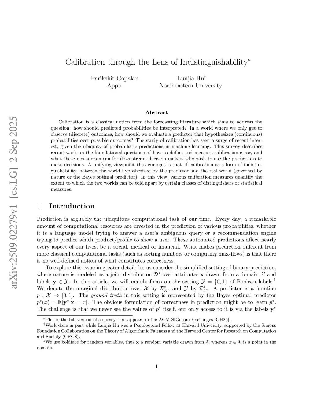 Calibration is a classical notion from the forecasting literature which aims to address the question: how should predicted probabilities be interpreted? In a world where we only get to observe (discrete) outcomes, how should we evaluate a predictor that hypothesizes (continuous) probabilities over possible outcomes? The study of calibration has seen a surge of recent interest, given the ubiquity of probabilistic predictions in machine learning. This survey describes recent work on the foundational questions of how to define and measure calibration error, and what these measures mean for downstream decision makers who wish to use the predictions to make decisions. A unifying viewpoint that emerges is that of calibration as a form of indistinguishability, between the world hypothesized by the predictor and the real world (governed by nature or the Bayes optimal predictor). In this view, various calibration measures quantify the extent to which the two worlds can be told apart by certain classes of distinguishers or statistical measures.