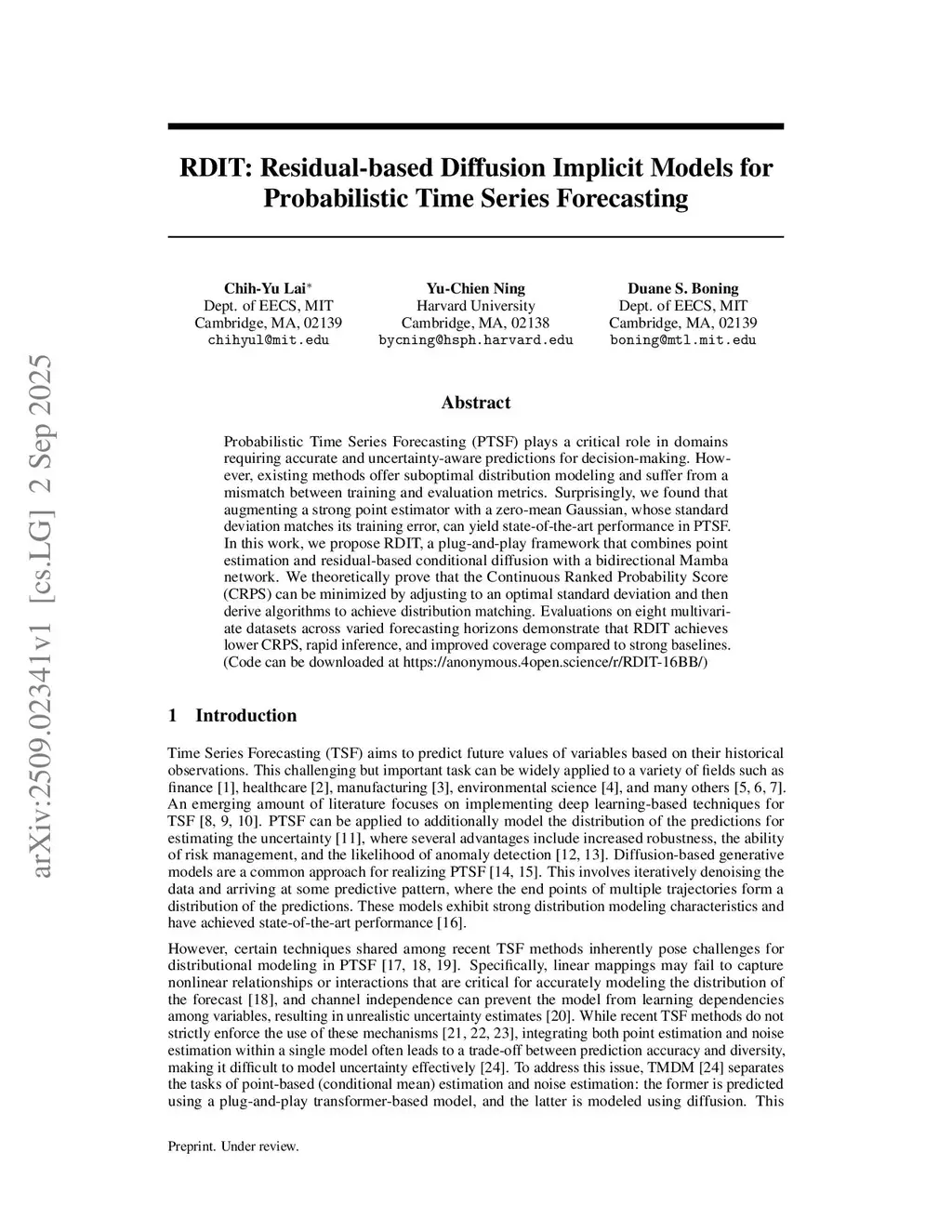 Probabilistic Time Series Forecasting (PTSF) plays a critical role in domains requiring accurate and uncertainty-aware predictions for decision-making. However, existing methods offer suboptimal distribution modeling and suffer from a mismatch between training and evaluation metrics. Surprisingly, we found that augmenting a strong point estimator with a zero-mean Gaussian, whose standard deviation matches its training error, can yield state-of-the-art performance in PTSF. In this work, we propose RDIT, a plug-and-play framework that combines point estimation and residual-based conditional diffusion with a bidirectional Mamba network. We theoretically prove that the Continuous Ranked Probability Score (CRPS) can be minimized by adjusting to an optimal standard deviation and then derive algorithms to achieve distribution matching. Evaluations on eight multivariate datasets across varied forecasting horizons demonstrate that RDIT achieves lower CRPS, rapid inference, and improved coverage compared to strong baselines.