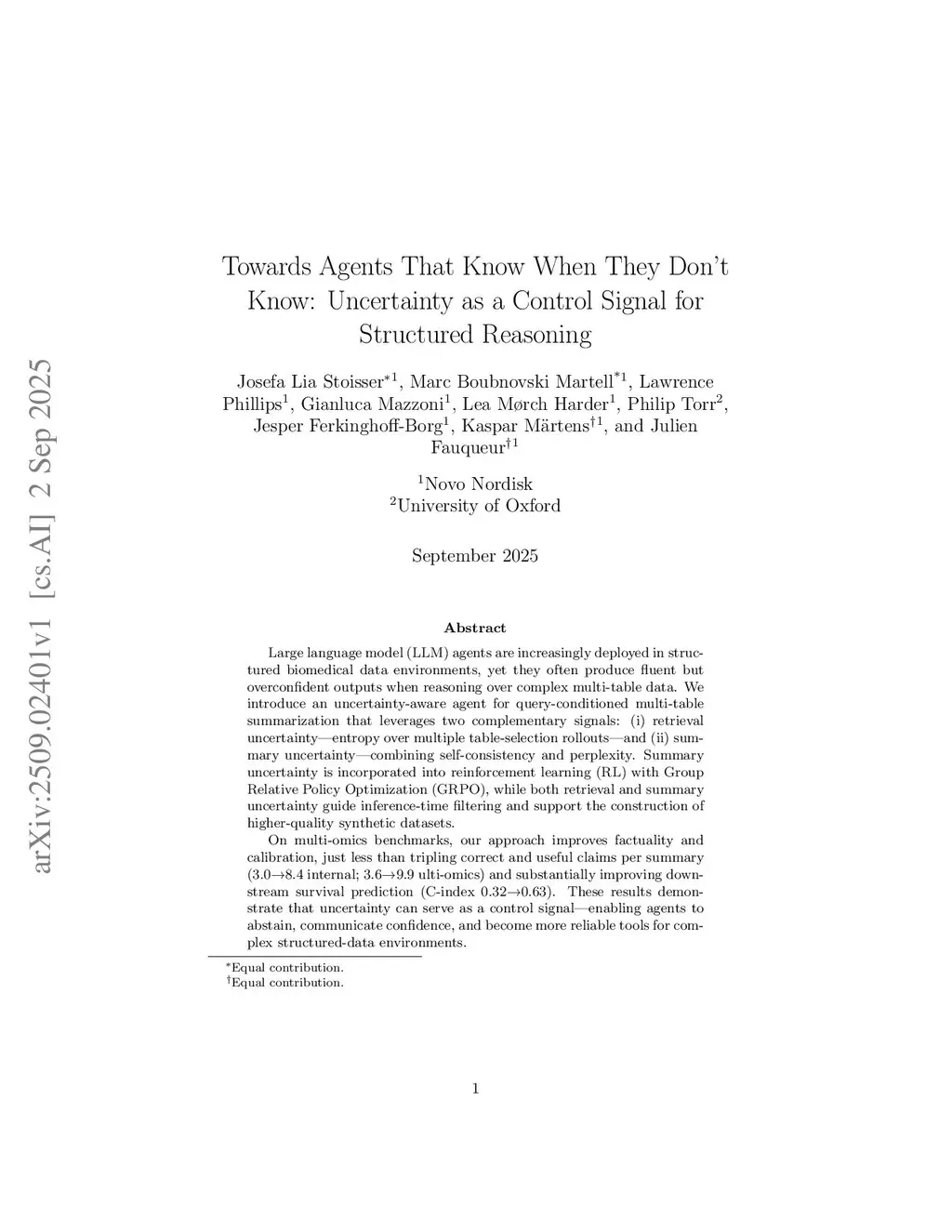 Large language model (LLM) agents are increasingly deployed in structured biomedical data environments, yet they often produce fluent but overconfident outputs when reasoning over complex multi-table data. We introduce an uncertainty-aware agent for query-conditioned multi-table summarization that leverages two complementary signals: (i) retrieval uncertainty--entropy over multiple table-selection rollouts--and (ii) summary uncertainty--combining self-consistency and perplexity. Summary uncertainty is incorporated into reinforcement learning (RL) with Group Relative Policy Optimization (GRPO), while both retrieval and summary uncertainty guide inference-time filtering and support the construction of higher-quality synthetic datasets.On multi-omics benchmarks, our approach improves factuality and calibration, nearly tripling correct and useful claims per summary (3.0\(\rightarrow\)8.4 internal; 3.6\(\rightarrow\)9.9 cancer multi-omics) and substantially improving downstream survival prediction (C-index 0.32\(\rightarrow\)0.63). These results demonstrate that uncertainty can serve as a control signal--enabling agents to abstain, communicate confidence, and become more reliable tools for complex structured-data environments.