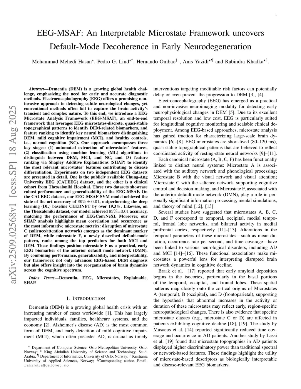 Dementia (DEM) is a growing global health challenge, underscoring the need for early and accurate diagnosis. Electroencephalography (EEG) provides a non-invasive window into brain activity, but conventional methods struggle to capture its transient complexity. We present the \textbf{EEG Microstate Analysis Framework (EEG-MSAF)}, an end-to-end pipeline that leverages EEG microstates discrete, quasi-stable topographies to identify DEM-related biomarkers and distinguish DEM, mild cognitive impairment (MCI), and normal cognition (NC). EEG-MSAF comprises three stages: (1) automated microstate feature extraction, (2) classification with machine learning (ML), and (3) feature ranking using Shapley Additive Explanations (SHAP) to highlight key biomarkers. We evaluate on two EEG datasets: the public Chung-Ang University EEG (CAUEEG) dataset and a clinical cohort from Thessaloniki Hospital. Our framework demonstrates strong performance and generalizability. On CAUEEG, EEG-MSAF-SVM achieves \textbf{89\% 0.01 accuracy}, surpassing the deep learning baseline CEEDNET by \textbf{19.3\%}. On the Thessaloniki dataset, it reaches \textbf{95\% 0.01 accuracy}, comparable to EEGConvNeXt. SHAP analysis identifies mean correlation and occurrence as the most informative metrics: disruption of microstate C (salience/attention network) dominates DEM prediction, while microstate F, a novel default-mode pattern, emerges as a key early biomarker for both MCI and DEM. By combining accuracy, generalizability, and interpretability, EEG-MSAF advances EEG-based dementia diagnosis and sheds light on brain dynamics across the cognitive spectrum.