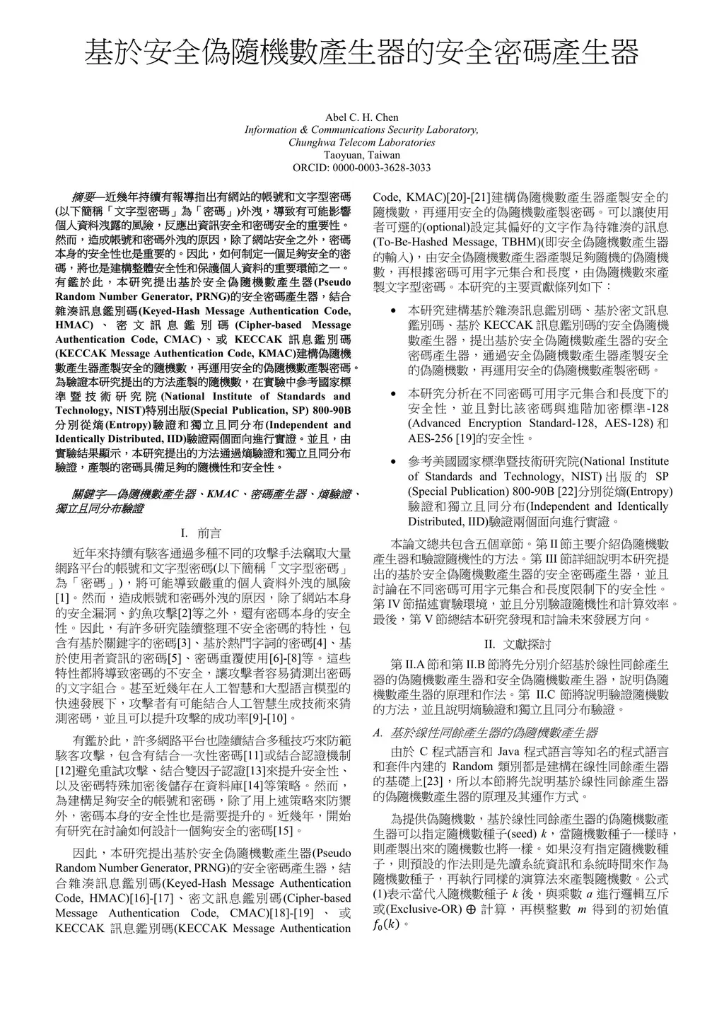 In recent years, numerous incidents involving the leakage of website accounts and text passwords (referred to as passwords) have raised significant concerns regarding the potential exposure of personal information. These events underscore the critical importance of both information security and password protection. While many of these breaches are attributable to vulnerabilities within website infrastructure, the strength and security of the passwords themselves also play a crucial role. Consequently, the creation of secure passwords constitutes a fundamental aspect of enhancing overall system security and protecting personal data. In response to these challenges, this study presents a secure password generation approach utilizing a cryptographically secure Pseudo-Random Number Generator (PRNG). The generator is implemented using a range of Message Authentication Code (MAC) algorithms, including the Keyed-Hash Message Authentication Code (HMAC), Cipher-based Message Authentication Code (CMAC), and KECCAK Message Authentication Code (KMAC), to produce robust random values suitable for password generation. To evaluate the proposed method, empirical assessments were conducted in accordance with the guidelines provided in the National Institute of Standards and Technology (NIST) Special Publication (SP) 800-90B. The evaluation focused on two primary aspects: entropy estimation and verification of independent and identically distributed (IID) properties. Experimental results indicate that the proposed method satisfies both entropy and IID requirements, thereby demonstrating its ability to generate passwords with a high degree of randomness and security.