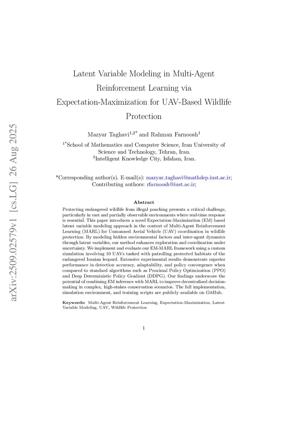 Protecting endangered wildlife from illegal poaching presents a critical challenge, particularly in vast and partially observable environments where real-time response is essential. This paper introduces a novel Expectation-Maximization (EM) based latent variable modeling approach in the context of Multi-Agent Reinforcement Learning (MARL) for Unmanned Aerial Vehicle (UAV) coordination in wildlife protection. By modeling hidden environmental factors and inter-agent dynamics through latent variables, our method enhances exploration and coordination underthis http URLimplement and evaluate our EM-MARL framework using a custom simulation involving 10 UAVs tasked with patrolling protected habitats of the endangered Iranian leopard. Extensive experimental results demonstrate superior performance in detection accuracy, adaptability, and policy convergence when compared to standard algorithms such as Proximal Policy Optimization (PPO) and Deep Deterministic Policy Gradient (DDPG). Our findings underscore the potential of combining EM inference with MARL to improve decentralized decisionmaking in complex, high-stakes conservation scenarios. The full implementation, simulation environment, and training scripts are publicly available on GitHub.