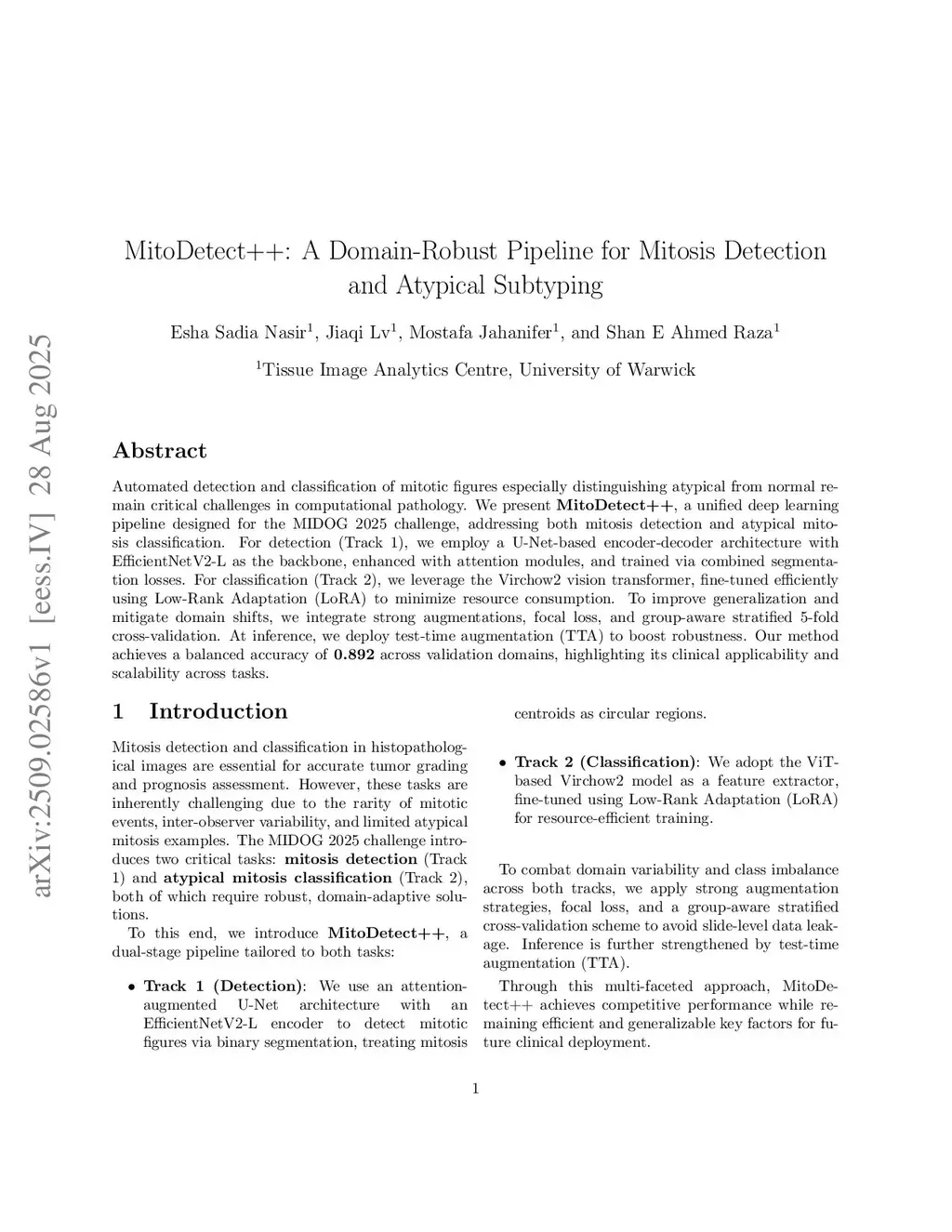 Automated detection and classification of mitotic figures especially distinguishing atypical from normal remain critical challenges in computational pathology. We present MitoDetect++, a unified deep learning pipeline designed for the MIDOG 2025 challenge, addressing both mitosis detection and atypical mitosis classification. For detection (Track 1), we employ a U-Net-based encoder-decoder architecture with EfficientNetV2-L as the backbone, enhanced with attention modules, and trained via combined segmentation losses. For classification (Track 2), we leverage the Virchow2 vision transformer, fine-tuned efficiently using Low-Rank Adaptation (LoRA) to minimize resource consumption. To improve generalization and mitigate domain shifts, we integrate strong augmentations, focal loss, and group-aware stratified 5-fold cross-validation. At inference, we deploy test-time augmentation (TTA) to boost robustness. Our method achieves a balanced accuracy of 0.892 across validation domains, highlighting its clinical applicability and scalability across tasks.
