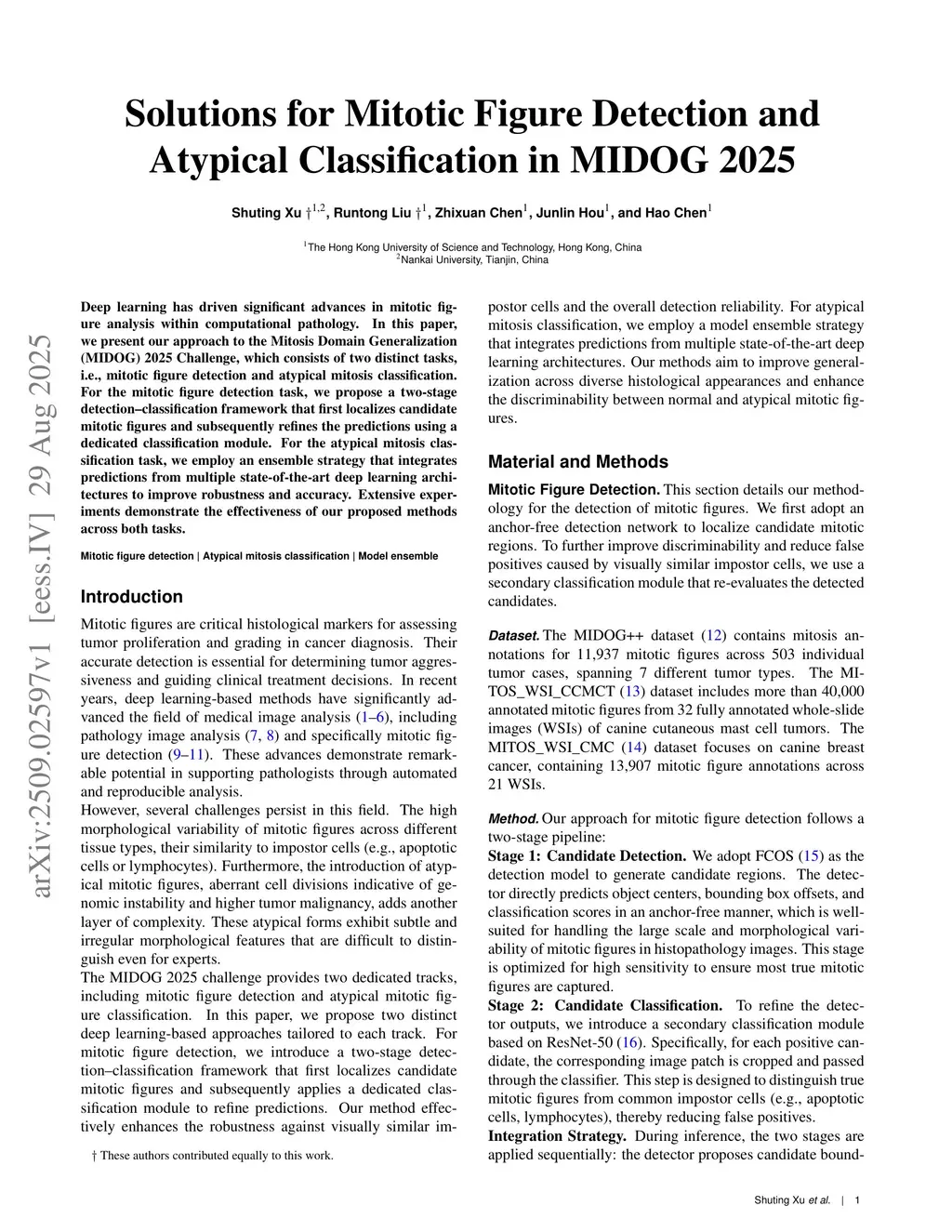 Deep learning has driven significant advances in mitotic figure analysis within computational pathology. In this paper, we present our approach to the Mitosis Domain Generalization (MIDOG) 2025 Challenge, which consists of two distinct tasks, i.e., mitotic figure detection and atypical mitosis classification. For the mitotic figure detection task, we propose a two-stage detection-classification framework that first localizes candidate mitotic figures and subsequently refines the predictions using a dedicated classification module. For the atypical mitosis classification task, we employ an ensemble strategy that integrates predictions from multiple state-of-the-art deep learning architectures to improve robustness and accuracy. Extensive experiments demonstrate the effectiveness of our proposed methods across both tasks.