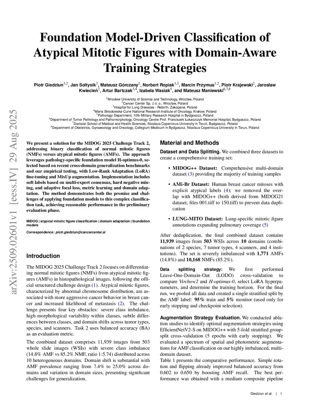 We present a solution for the MIDOG 2025 Challenge Track~2, addressing binary classification of normal mitotic figures (NMFs) versus atypical mitotic figures (AMFs). The approach leverages pathology-specific foundation model H-optimus-0, selected based on recent cross-domain generalization benchmarks and our empirical testing, with Low-Rank Adaptation (LoRA) fine-tuning and MixUp augmentation. Implementation includes soft labels based on multi-expert consensus, hard negative mining, and adaptive focal loss, metric learning and domain adaptation. The method demonstrates both the promise and challenges of applying foundation models to this complex classification task, achieving reasonable performance in the preliminary evaluation phase.