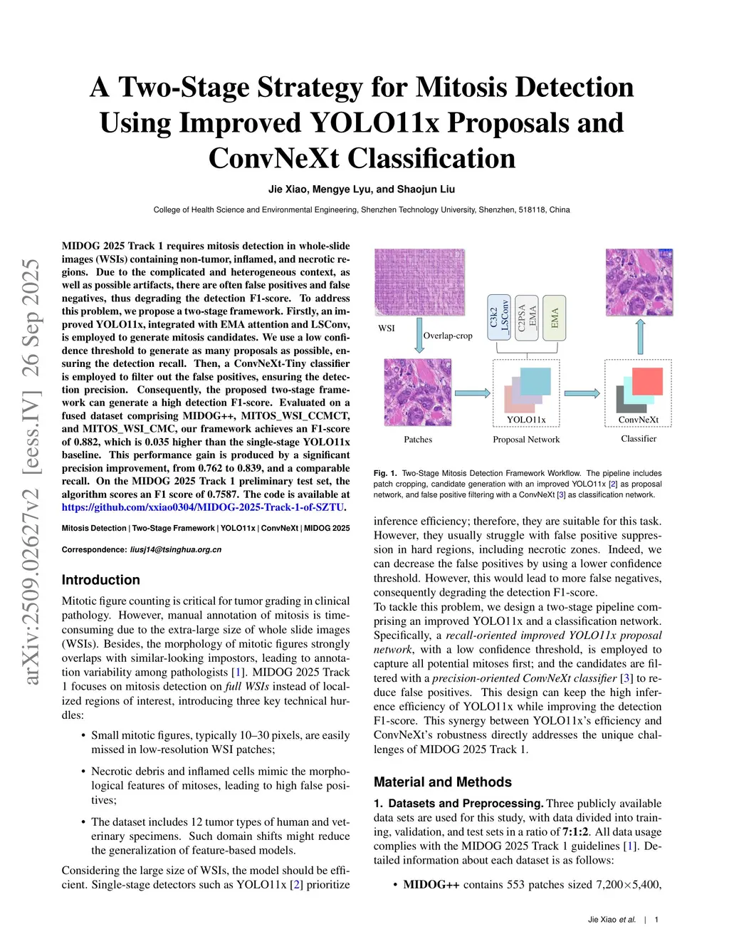 MIDOG 2025 Track 1 requires mitosis detection in whole-slideimages (WSIs) containing non-tumor, inflamed, and necrotic re-gions. Due to the complicated and heterogeneous context, aswell as possible artifacts, there are often false positives and falsenegatives, thus degrading the detection F1-score. To addressthis problem, we propose a two-stage framework. Firstly, an im-proved YOLO11x, integrated with EMA attention and LSConv,is employed to generate mitosis candidates. We use a low confi-dence threshold to generate as many proposals as possible, en-suring the detection recall. Then, a ConvNeXt-Tiny classifieris employed to filter out the false positives, ensuring the detec-tion precision. Consequently, the proposed two-stage frame-work can generate a high detection F1-score. Evaluated on afused dataset comprising MIDOG++, MITOS_WSI_CCMCT,and MITOS_WSI_CMC, our framework achieves an F1-scoreof 0.882, which is 0.035 higher than the single-stage YOLO11xbaseline. This performance gain is produced by a significantprecision improvement, from 0.762 to 0.839, and a comparablerecall. On the MIDOG 2025 Track 1 preliminary test set, thealgorithm scores an F1 score of 0.7587. The code is available athttps://github.com/xxiao0304/MIDOG-2025-Track-1-of-SZTU.