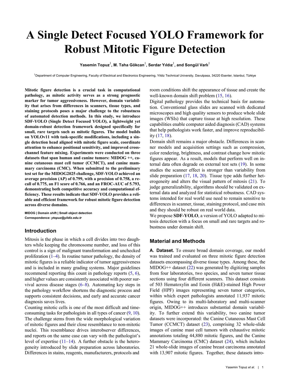 Mitotic figure detection is a crucial task in computational pathology, as mitotic activity serves as a strong prognostic marker for tumor aggressiveness. However, domain variability that arises from differences in scanners, tissue types, and staining protocols poses a major challenge to the robustness of automated detection methods. In this study, we introduce SDF-YOLO (Single Detect Focused YOLO), a lightweight yet domain-robust detection framework designed specifically for small, rare targets such as mitotic figures. The model builds on YOLOv11 with task-specific modifications, including a single detection head aligned with mitotic figure scale, coordinate attention to enhance positional sensitivity, and improved cross-channel feature mixing. Experiments were conducted on three datasets that span human and canine tumors: MIDOG ++, canine cutaneous mast cell tumor (CCMCT), and canine mammary carcinoma (CMC). When submitted to the preliminary test set for the MIDOG2025 challenge, SDF-YOLO achieved an average precision (AP) of 0.799, with a precision of 0.758, a recall of 0.775, an F1 score of 0.766, and an FROC-AUC of 5.793, demonstrating both competitive accuracy and computational efficiency. These results indicate that SDF-YOLO provides a reliable and efficient framework for robust mitotic figure detection across diverse domains.