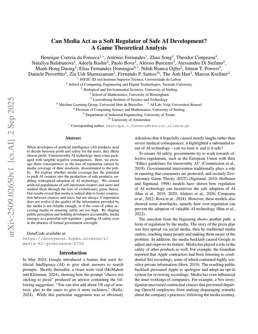 When developers of artificial intelligence (AI) products need to decide between profit and safety for the users, they likely choose profit. Untrustworthy AI technology must come packaged with tangible negative consequences. Here, we envisage those consequences as the loss of reputation caused by media coverage of their misdeeds, disseminated to the public. We explore whether media coverage has the potential to push AI creators into the production of safe products, enabling widespread adoption of AI technology. We created artificial populations of self-interested creators and users and studied them through the lens of evolutionary game theory. Our results reveal that media is indeed able to foster cooperation between creators and users, but not always. Cooperation does not evolve if the quality of the information provided by the media is not reliable enough, or if the costs of either accessing media or ensuring safety are too high. By shaping public perception and holding developers accountable, media emerges as a powerful soft regulator -- guiding AI safety even in the absence of formal government oversight.