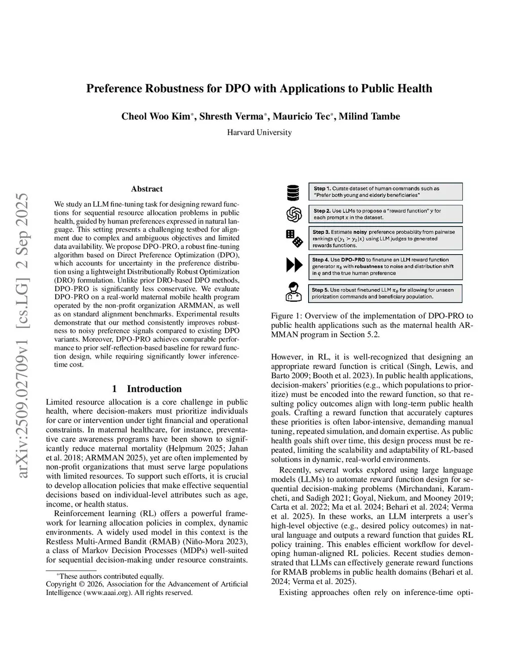 We study an LLM fine-tuning task for designing reward functions for sequential resource allocation problems in public health, guided by human preferences expressed in natural language. This setting presents a challenging testbed for alignment due to complex and ambiguous objectives and limited data availability. We propose DPO-PRO, a robust fine-tuning algorithm based on Direct Preference Optimization (DPO), which accounts for uncertainty in the preference distribution using a lightweight Distributionally Robust Optimization (DRO) formulation. Unlike prior DRO-based DPO methods, DPO-PRO is significantly less conservative. We evaluate DPO-PRO on a real-world maternal mobile health program operated by the non-profit organization ARMMAN, as well as on standard alignment benchmarks. Experimental results demonstrate that our method consistently improves robustness to noisy preference signals compared to existing DPO variants. Moreover, DPO-PRO achieves comparable performance to prior self-reflection-based baseline for reward function design, while requiring significantly lower inference-time cost.
