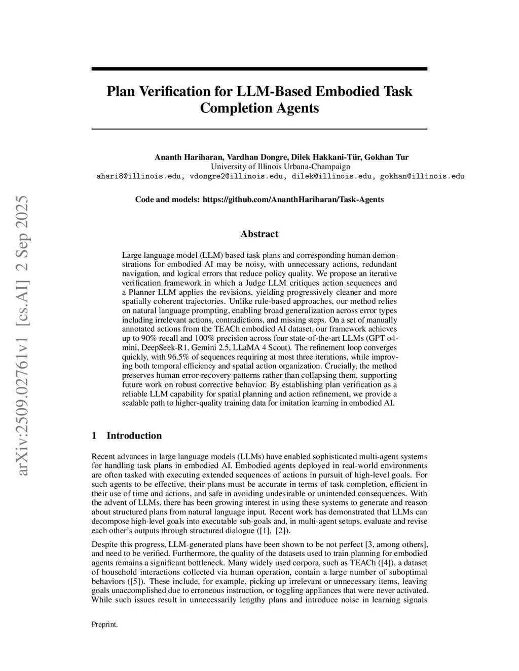 Large language model (LLM) based task plans and corresponding human demonstrations for embodied AI may be noisy, with unnecessary actions, redundant navigation, and logical errors that reduce policy quality. We propose an iterative verification framework in which a Judge LLM critiques action sequences and a Planner LLM applies the revisions, yielding progressively cleaner and more spatially coherent trajectories. Unlike rule-based approaches, our method relies on natural language prompting, enabling broad generalization across error types including irrelevant actions, contradictions, and missing steps. On a set of manually annotated actions from the TEACh embodied AI dataset, our framework achieves up to 90% recall and 100% precision across four state-of-the-art LLMs (GPT o4-mini, DeepSeek-R1, Gemini 2.5, LLaMA 4 Scout). The refinement loop converges quickly, with 96.5% of sequences requiring at most three iterations, while improving both temporal efficiency and spatial action organization. Crucially, the method preserves human error-recovery patterns rather than collapsing them, supporting future work on robust corrective behavior. By establishing plan verification as a reliable LLM capability for spatial planning and action refinement, we provide a scalable path to higher-quality training data for imitation learning in embodied AI.