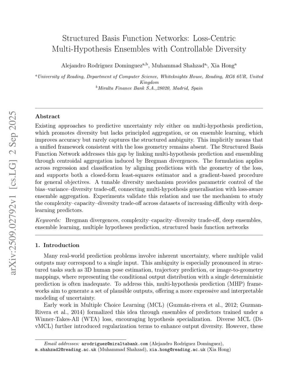 Existing approaches to predictive uncertainty rely either on multi-hypothesis prediction, which promotes diversity but lacks principled aggregation, or on ensemble learning, which improves accuracy but rarely captures the structured ambiguity. This implicitly means that a unified framework consistent with the loss geometry remains absent. The Structured Basis Function Network addresses this gap by linking multi-hypothesis prediction and ensembling through centroidal aggregation induced by Bregman divergences. The formulation applies across regression and classification by aligning predictions with the geometry of the loss, and supports both a closed-form least-squares estimator and a gradient-based procedure for general objectives. A tunable diversity mechanism provides parametric control of the bias-variance-diversity trade-off, connecting multi-hypothesis generalisation with loss-aware ensemble aggregation. Experiments validate this relation and use the mechanism to study the complexity-capacity-diversity trade-off across datasets of increasing difficulty with deep-learning predictors.
